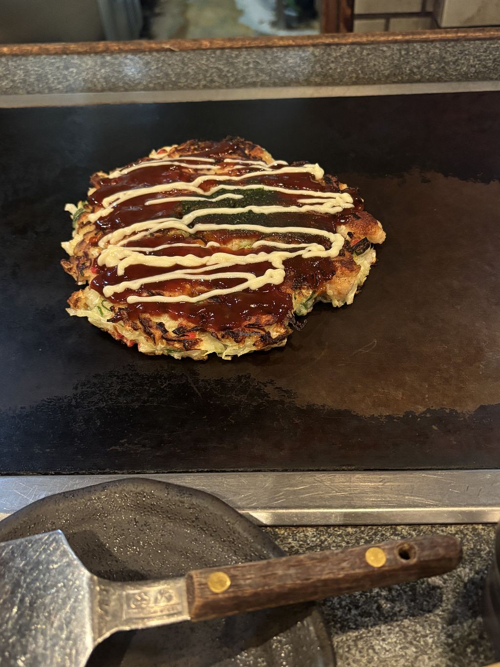 Ordered the okonomiyaki with soy meat. It’s shockingly flavorless. It’s just a mushy soggy batter with flavorless cabbage. The batter tastes like nothing. The cabbage is just filler. The soy meat is pvt that was just heated with water. Then some sweet sauce on top. The thing is so flavorless that even the grill doesn’t help. So far the worst food I’ve had in Japan.