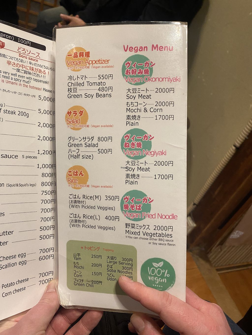 I ordered vegan Negiyaki with vegan meat with the large size (300 Yen on top for the size) and I was disappointed. While the size seemed alright, I had two small pieces of vegan meat, which wasn't worth it.