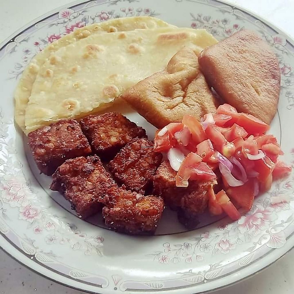 Chapati, Vegan meat, Mahamri and Kachumbari