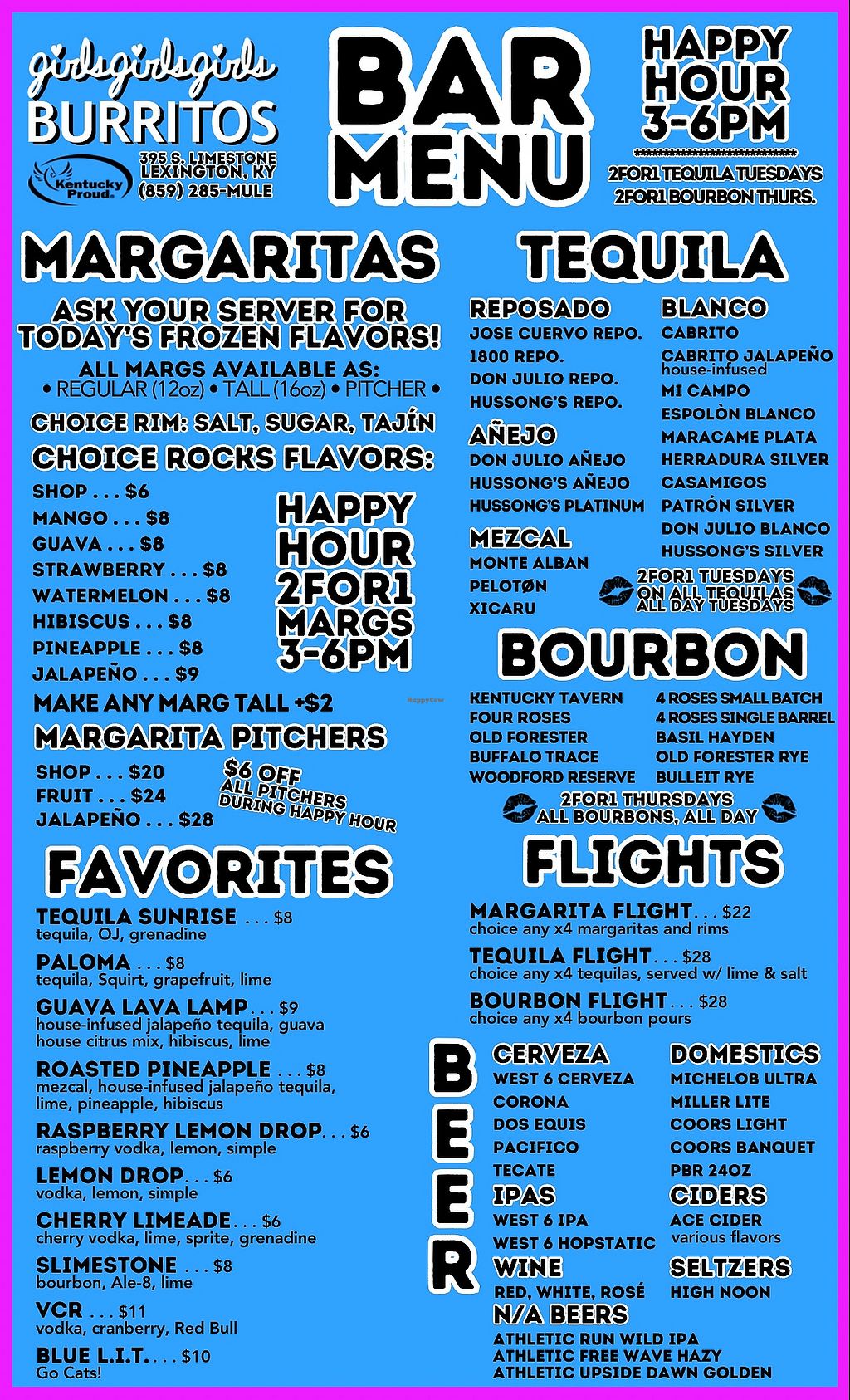 Serves meat, vegan options available. The vegan burritos are labeled. Trivia Sundays @6:30pm, Karaoke Mondays @8pm. Has two for one cocktails Mon, Tue, & Thur. Open Wed 11:00am-9:00pm, Thu-Fri 11:00am-12:00am, Sat 12:00pm-12:00am, Sun 12:00pm-9:00pm.