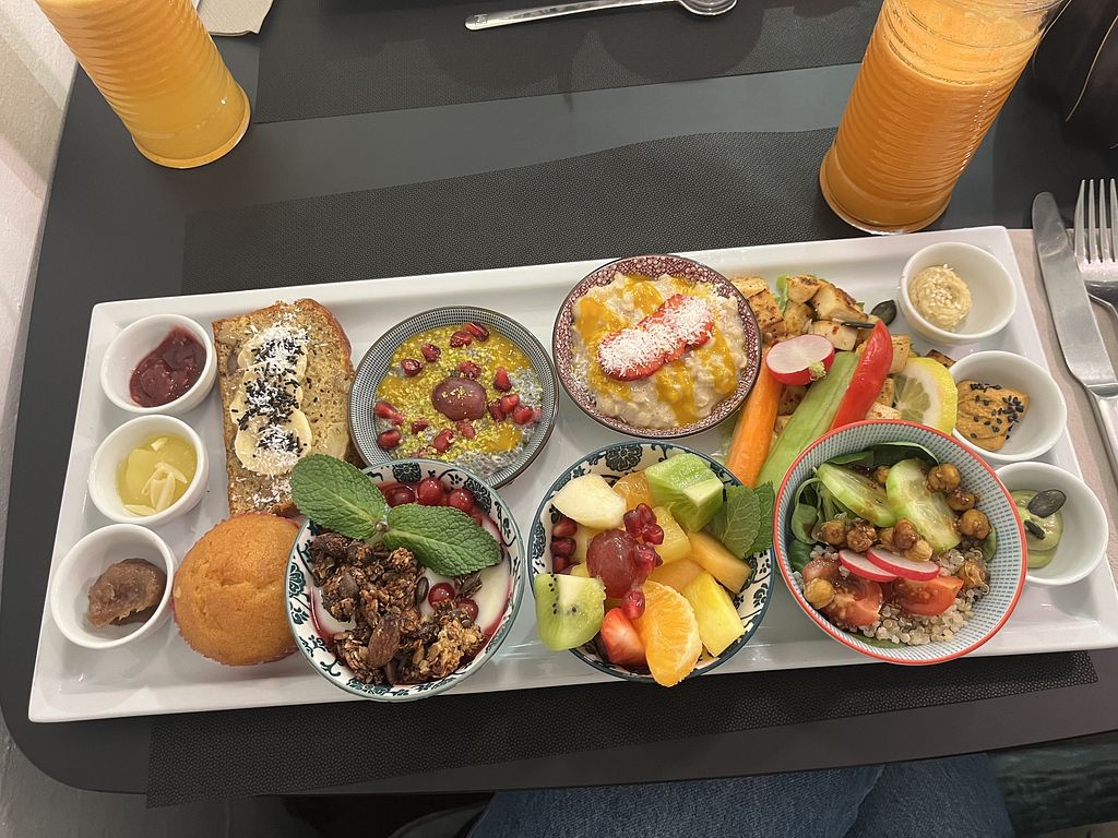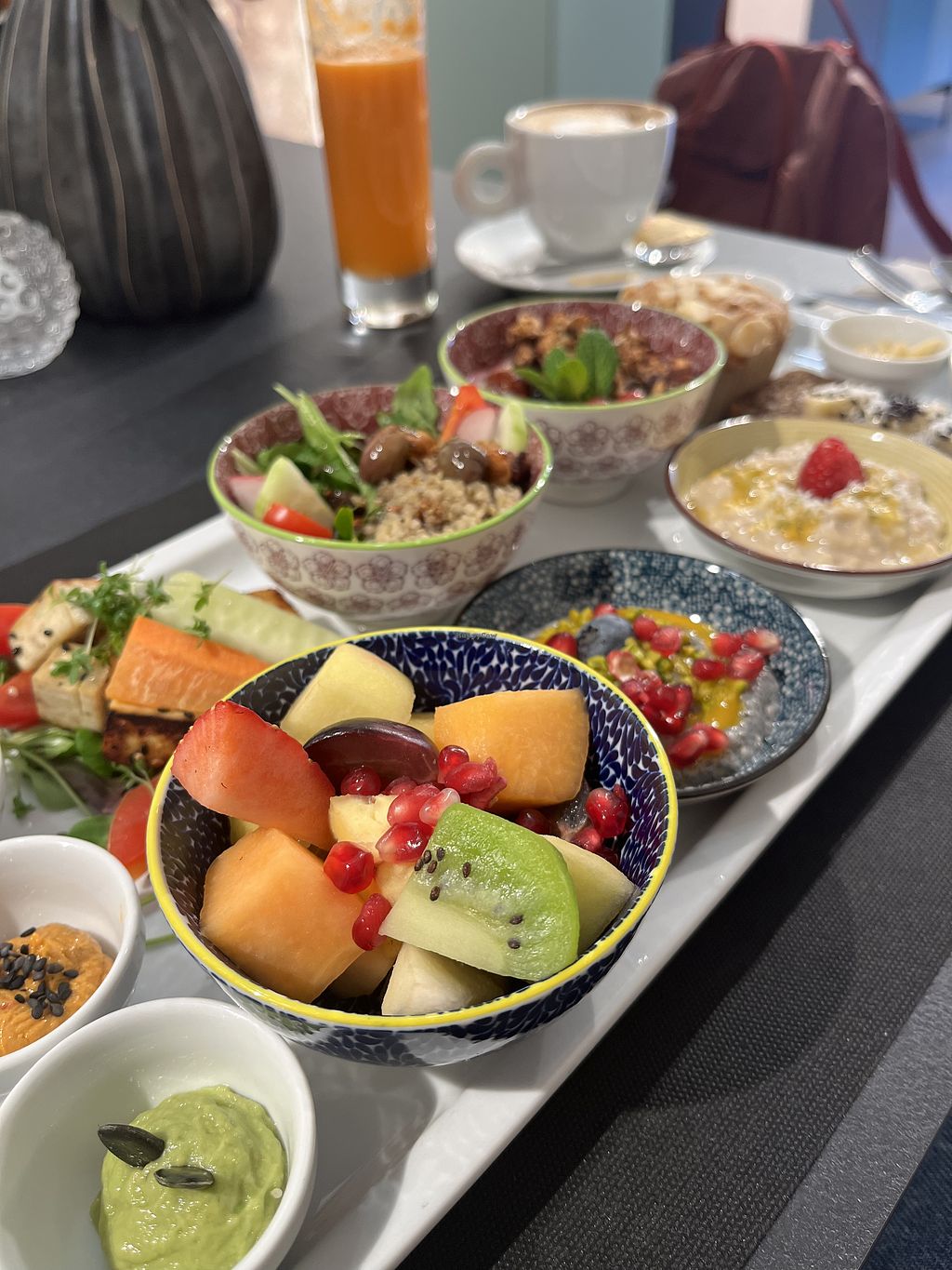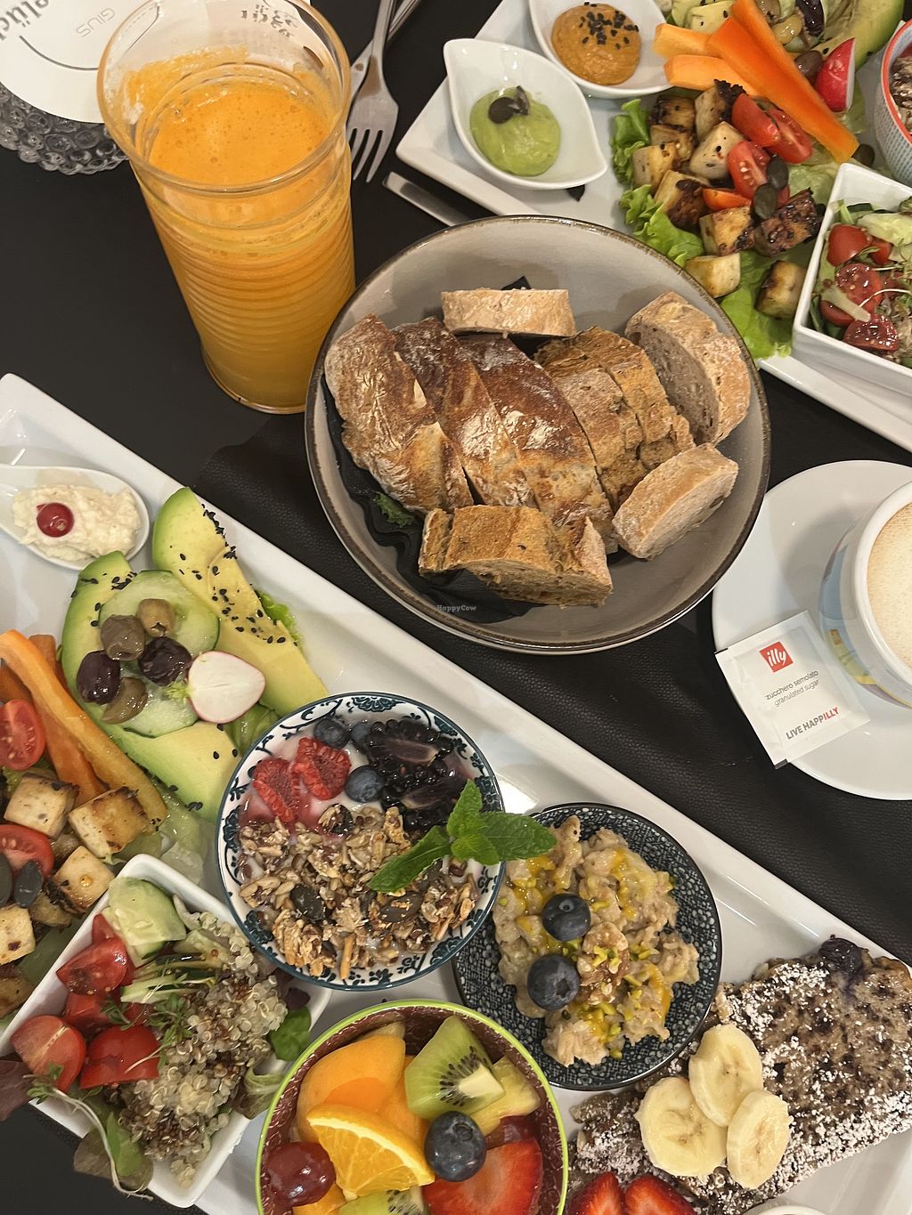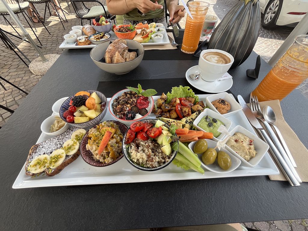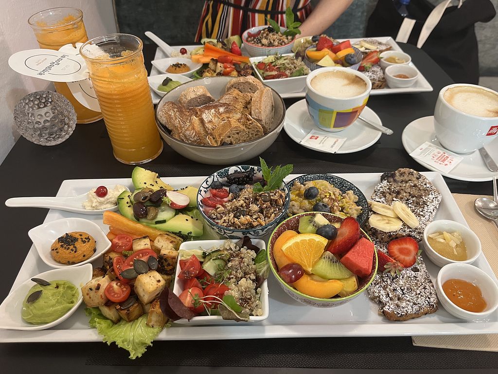 Veganer Brunch mit Brotkorb, Saft und Heißgetränk