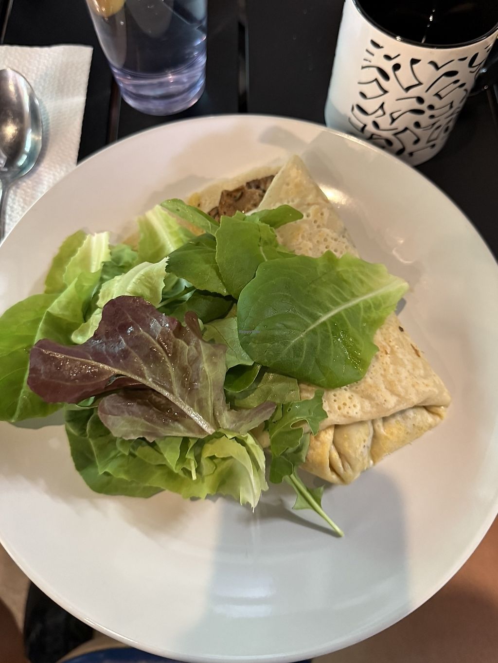 We walked in and told the owner we were vegan. After a whole weekend of eating basically salads, it was a pleasant surprise to hear her say "I got you" - she whipped up a delicious savory crepe with tofu, spinach, tomatoes, and vegan gouda. The tofu was well spiced. She also made us a sweet crepe with raspberries, bananas, and vegan dark chocolate. It didn't look great in a photo but tasted great! My only critique is I wish the crepe was a little more crispy. We then went next door to the coffee shop and got a 10% discount. They collaborate with the coffee shop so you can eat the crepes with some coffee. (The cafe also had vegan dessert and a vegan soup).