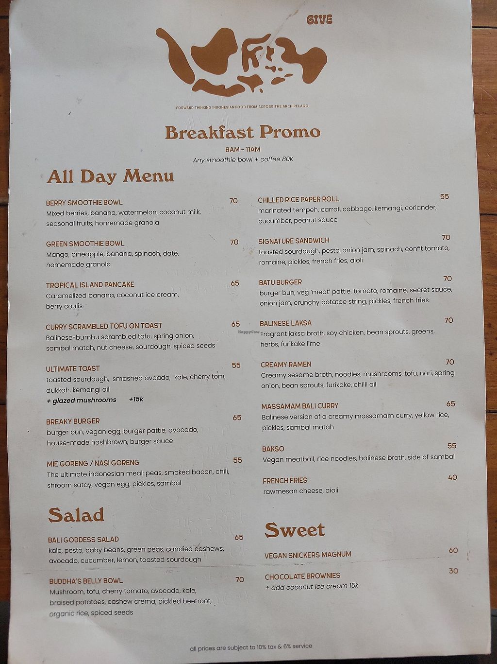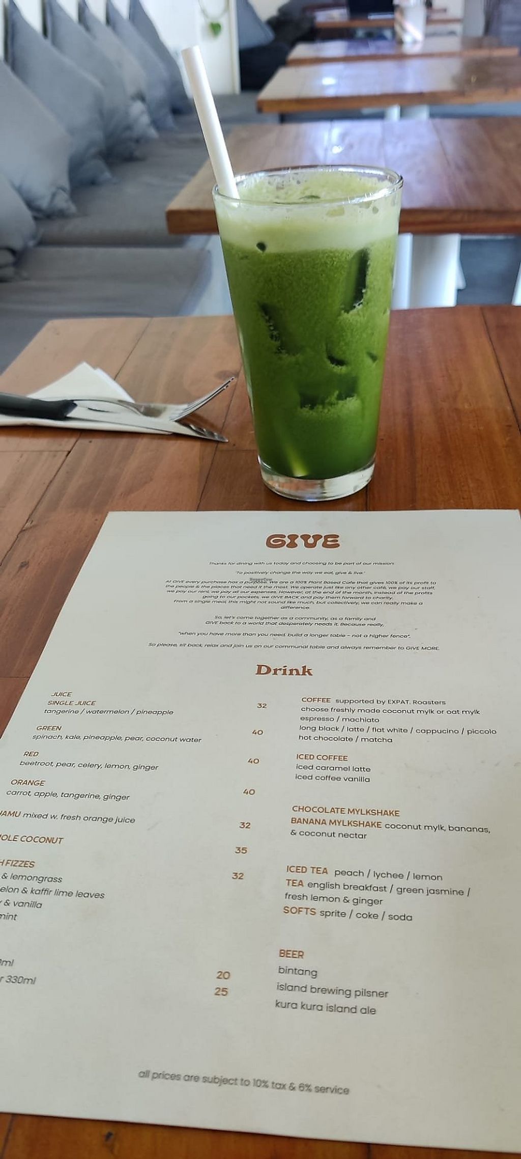 I haven’t eaten in at this place yet but I really enjoyed the food we ordered on Gojek. I ordered the Mi Goreng which came with a vegan fried egg! Really good and definitely hit my noodle cravings. I also ordered a side of tofu and tempe which was also really good. I am looking forward to visiting Give Cafe in person when it re opens. 😊