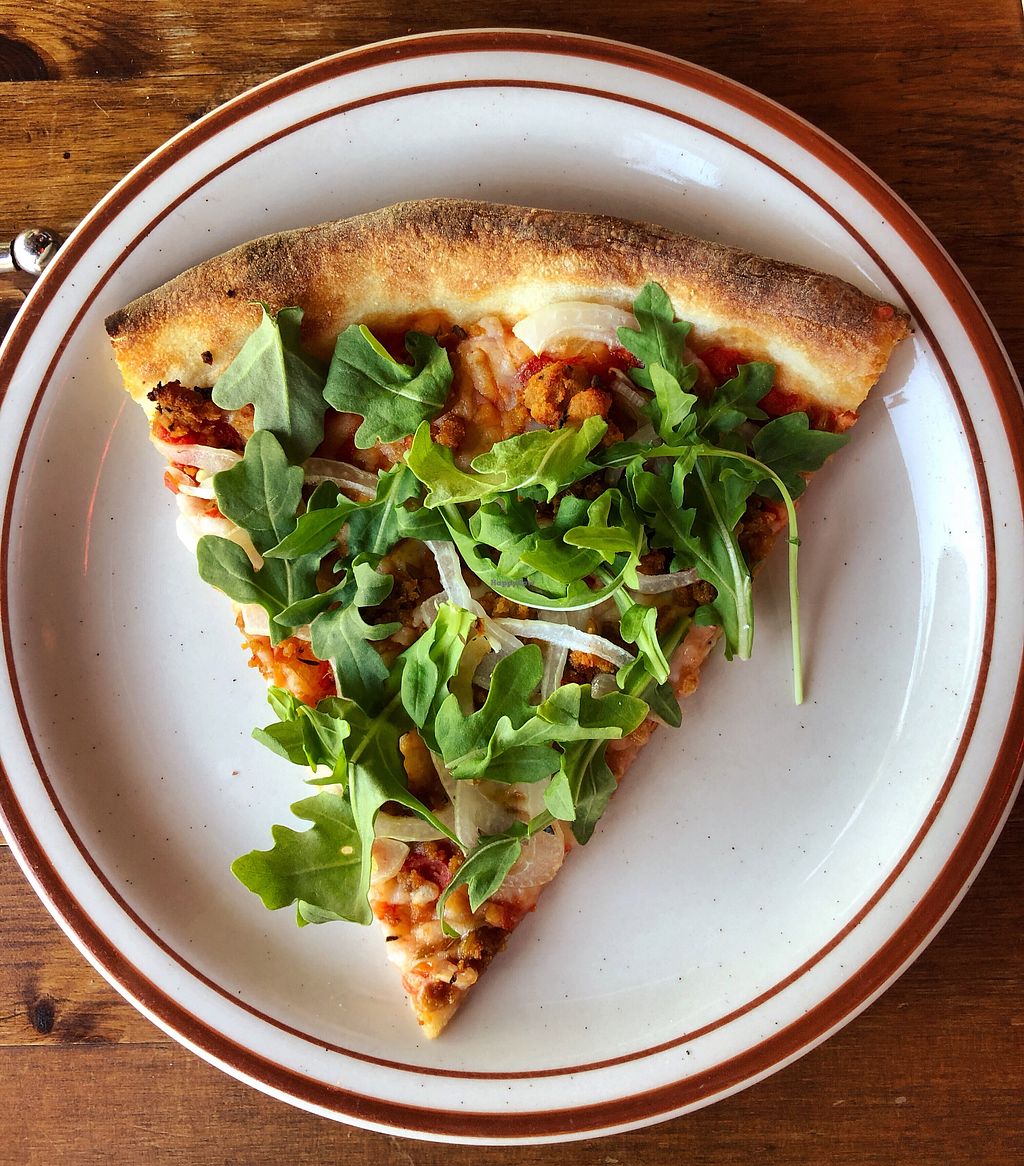 Serves meat, vegan options available. Pizzeria and bar lounge. Began offering Daiya vegan cheese in 2015. Has a vegan Caesar salad and antipasta options such as olives, artichoke hearts, and pickled vegetables that can be ordered individually or together as an antipasta plate. A section of the restaurant allows minors. The atmosphere is quirky with one wall is covered with a giant mural. Reported closed September 2024.