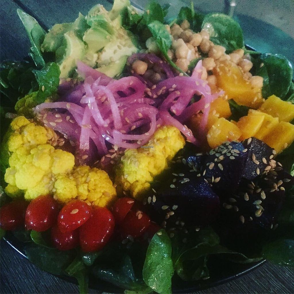 Baby kale Cobb salad with avo, tomatoes, pickled beets, curry cauliflo…