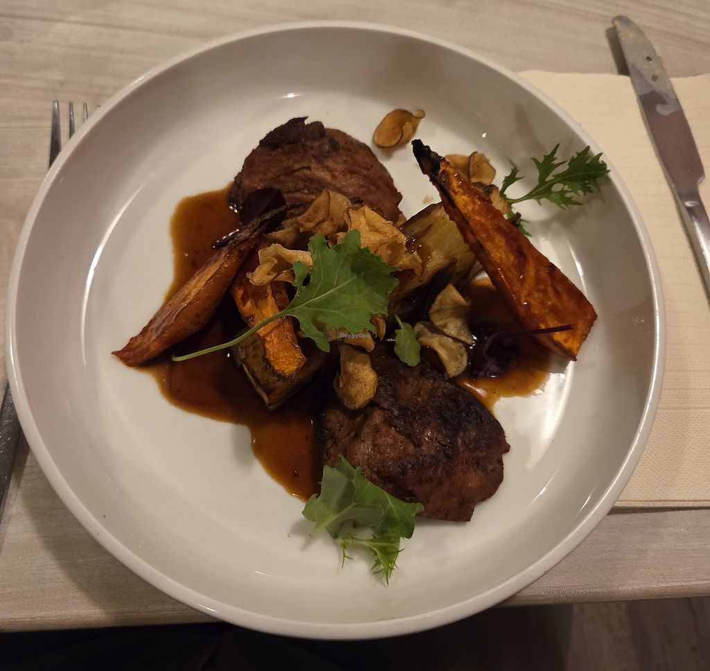Steak mit Kartoffel Mille-feuille und Glasierten Karotten