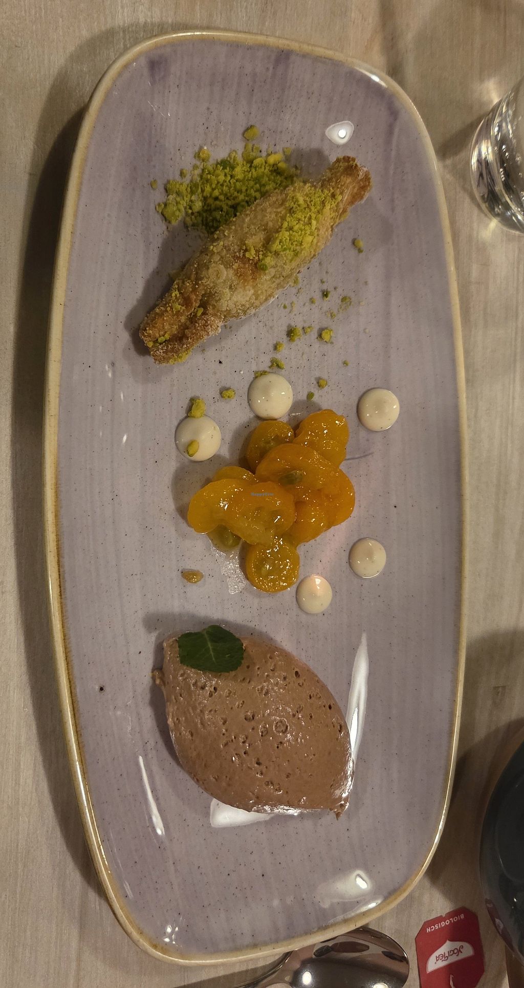 Pistazien-Knusper-Bonbon mit Vanillecreme, Mousse au Chocolat und Kumq…