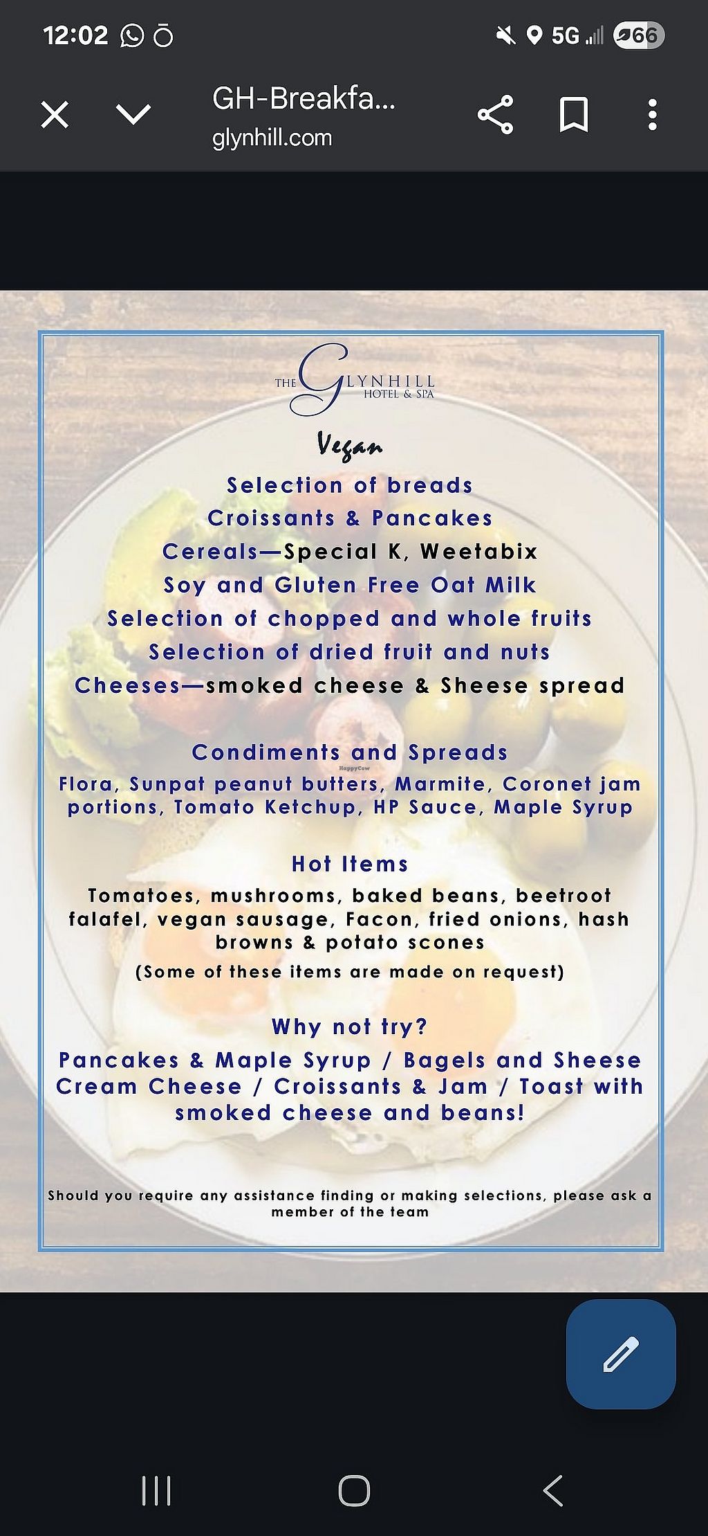 Full vegan breakfast menu, not all items were available on the day but could be requested. Bar menu has a couple of vegan options listed, I had the thai curry with butternut squash. I think the main restaurant has a separate vegan menu but I only stayed 1 night so didn't try this.