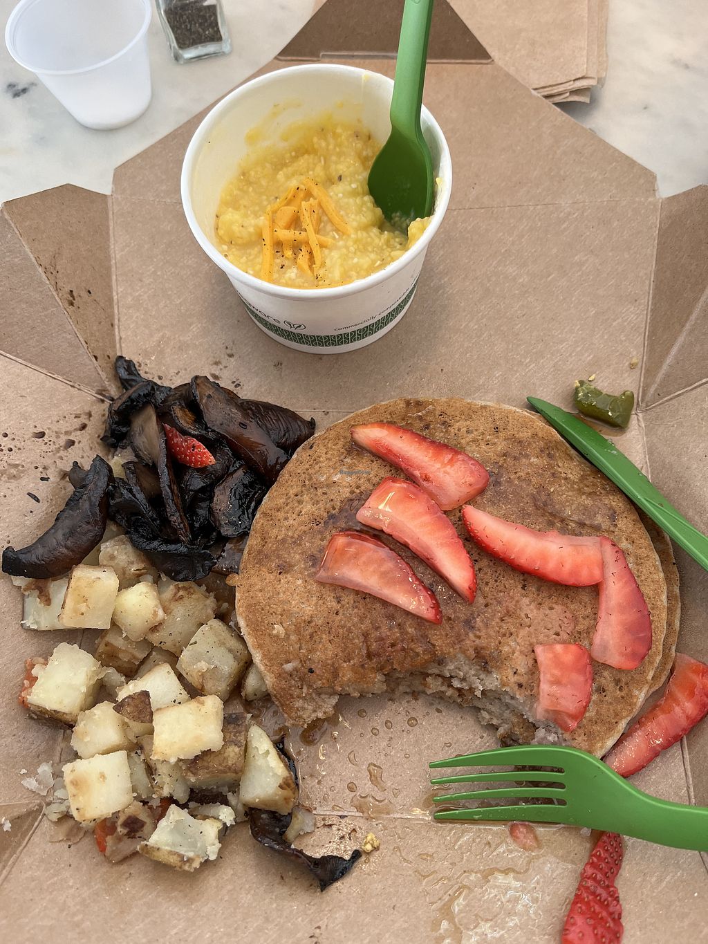 We highly recommend the Southern-style cheesy grits, scrambled tofu and portobello-bacon bowl as well as the oatmeal breakfast smoothie.