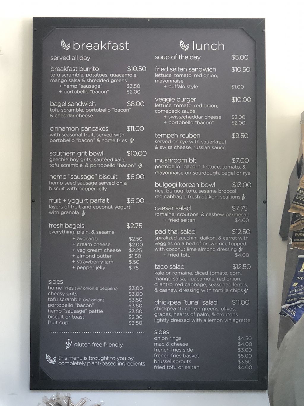 yum! buffalo fried seitan caesar salad a bit underwhelming, but still really good— especially compared to the other minimal options around town. loved the local one love kombucha too :) little expensive but worth the stop, breakfast items looked great!