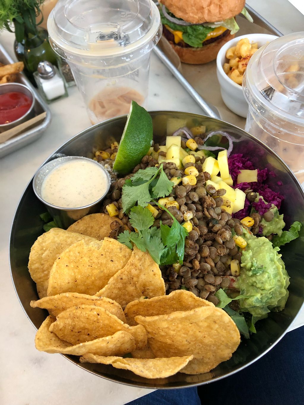 Amazing vegan food ! I got the taco salad and it was delicious! We also ordered the veggie burger and the fries and Mac and cheese was absolutely amazing! Very beautiful aesthetic!