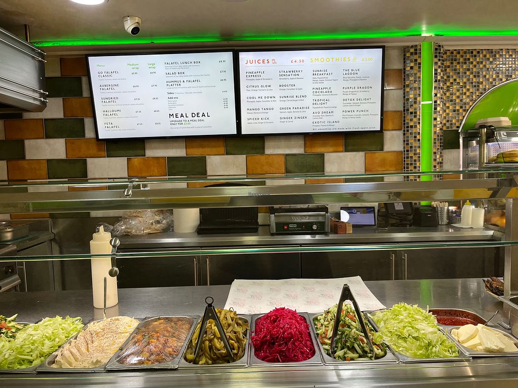 Go falafel has a few locations in Manchester and they are all the same. They are takeaway only with the same menu.