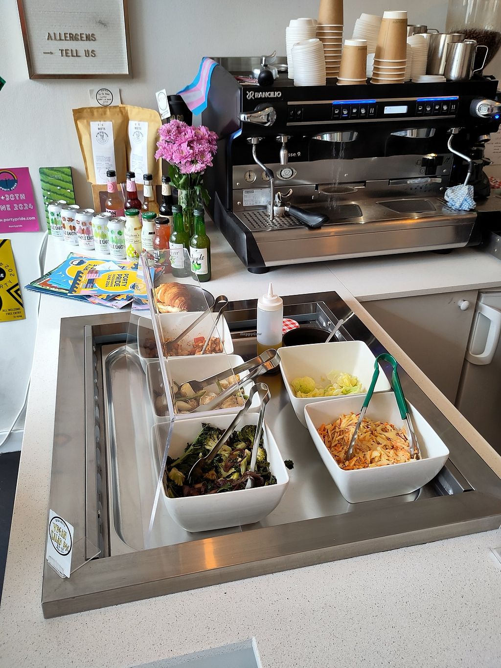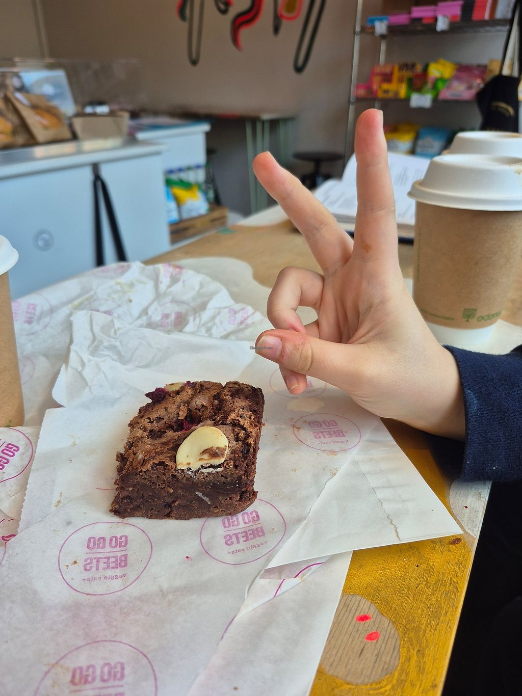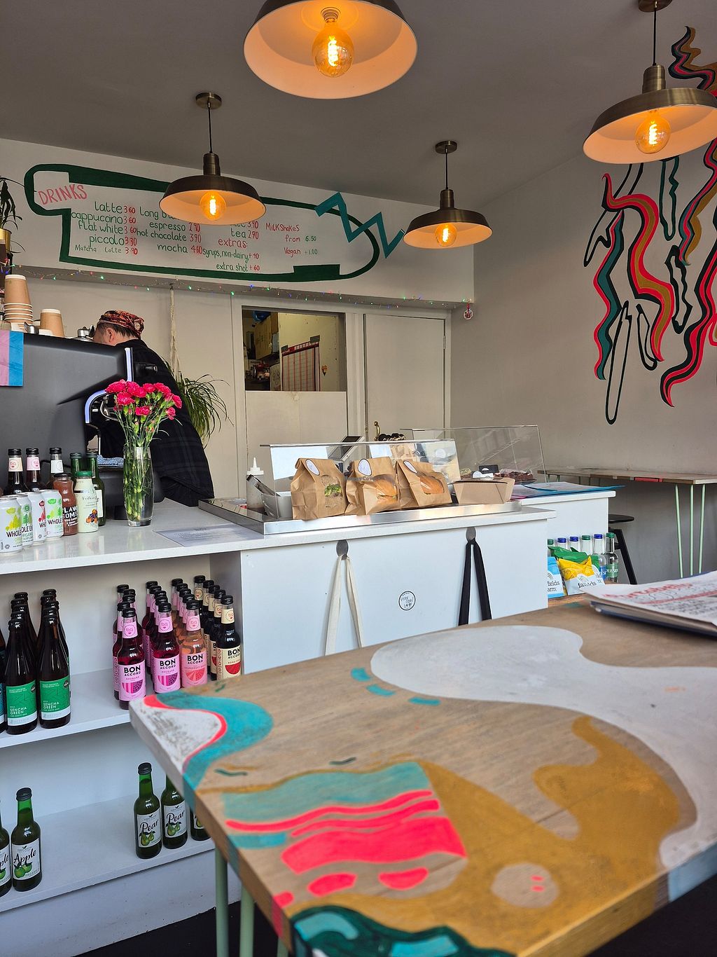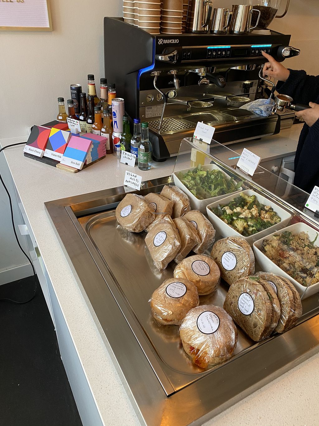 Had an oat latte, slaw and vegan cheeze roll and a brownie. The slaw was really nice. Nice friendly guy and music. Sat in.