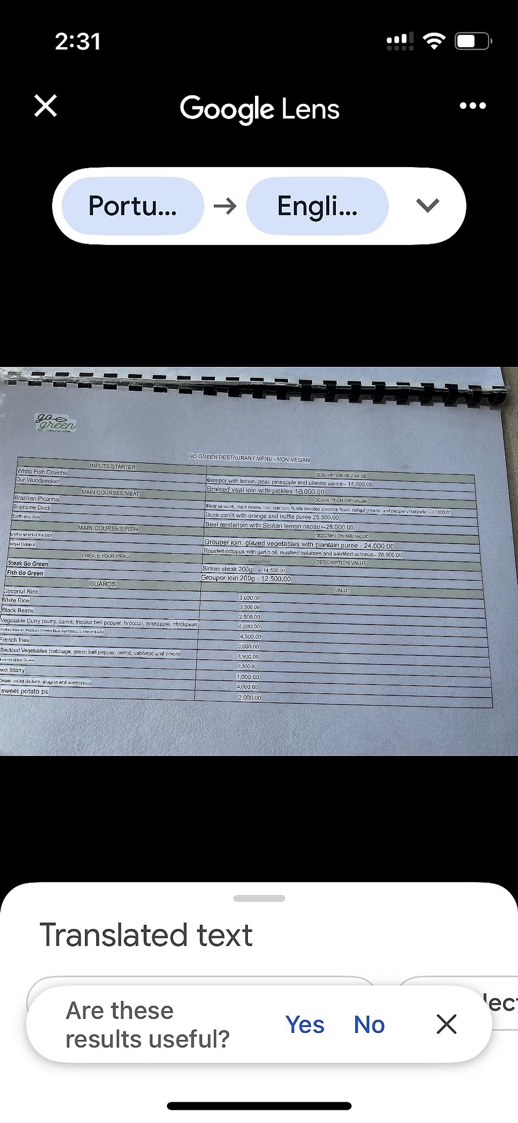 Vegan menu