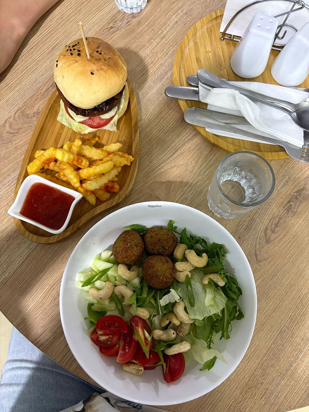 De burgers hier zijn erg klein en vullen totaal niet en je krijgt ook weinig frietjes erbij. De gekarameliseerde ui, de sausjes en het broodje zelf was wel lekker, maar de falafelburger zelf niet. Op die manier maar goed dat het klein was haha. De salade die mijn vriendin zelf had samen gesteld viel wel in de smaak en vond ze lekker.