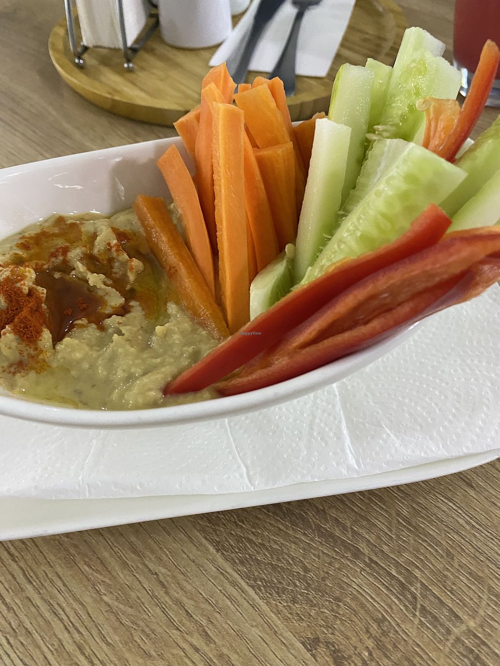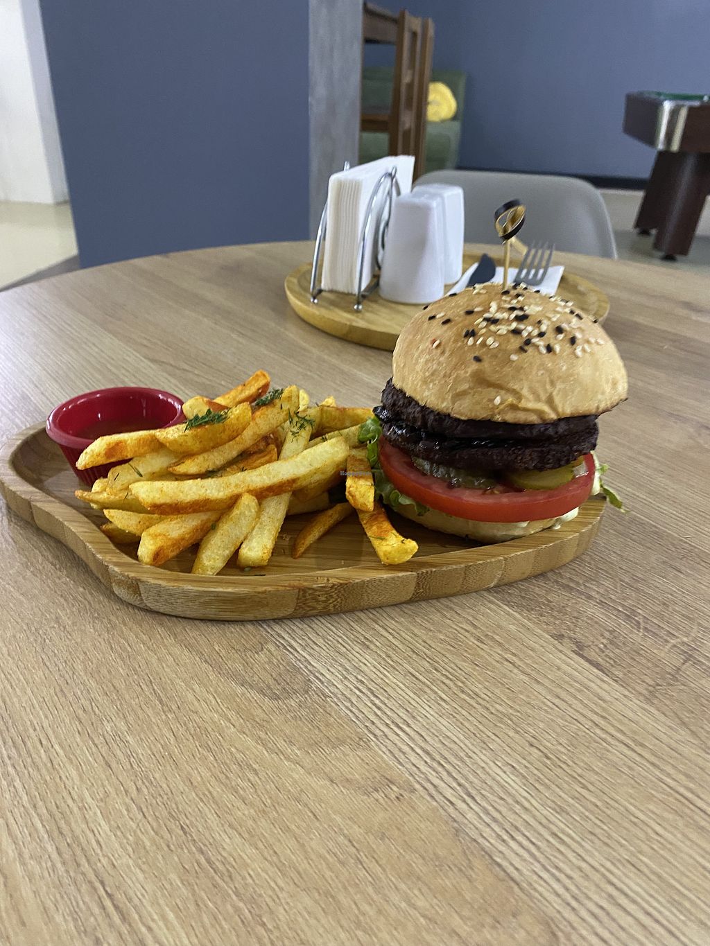 I had the hummus with veg for starter, vegan burger for main and medok for dessert, plus a berry lemonade. The dishes all came very quickly and tasted fresh. The burger was very good and my favourite part of the dish. The staff were tentative and helpful too. The space is large and open and includes a pool table too.