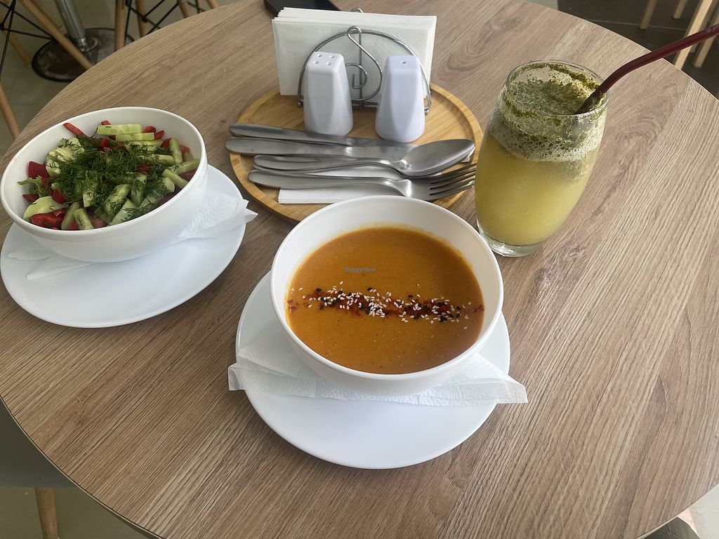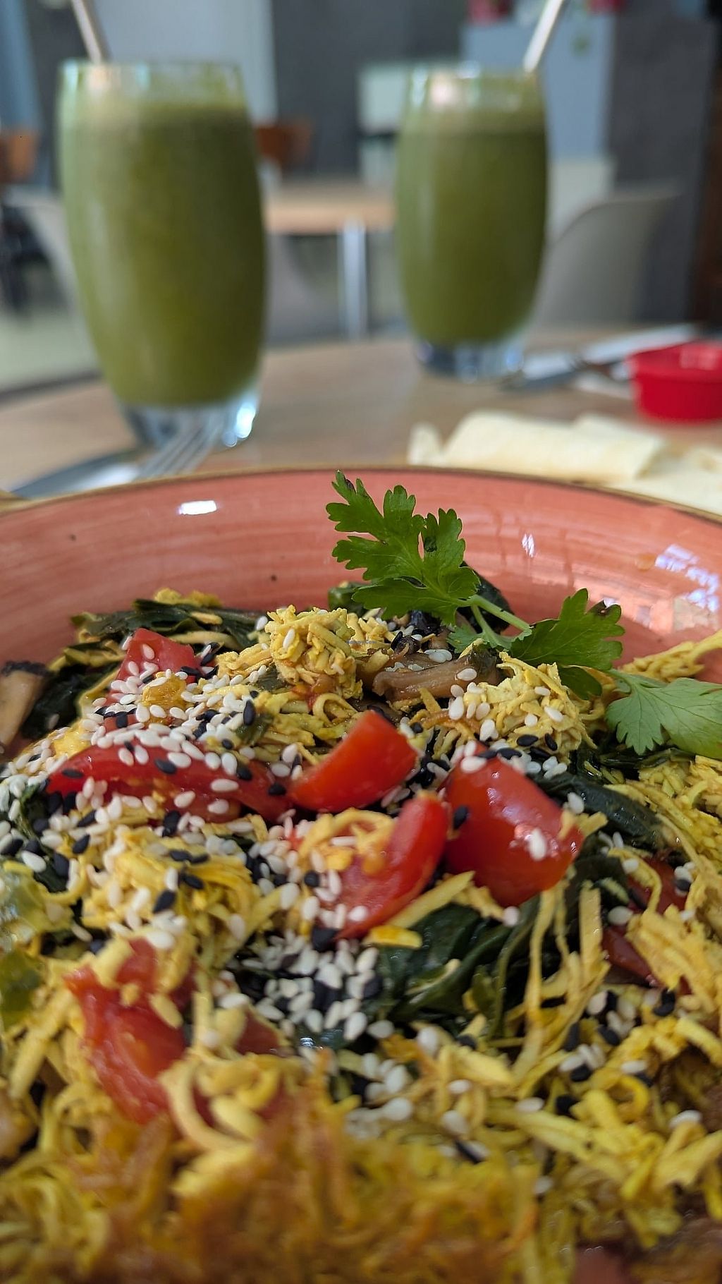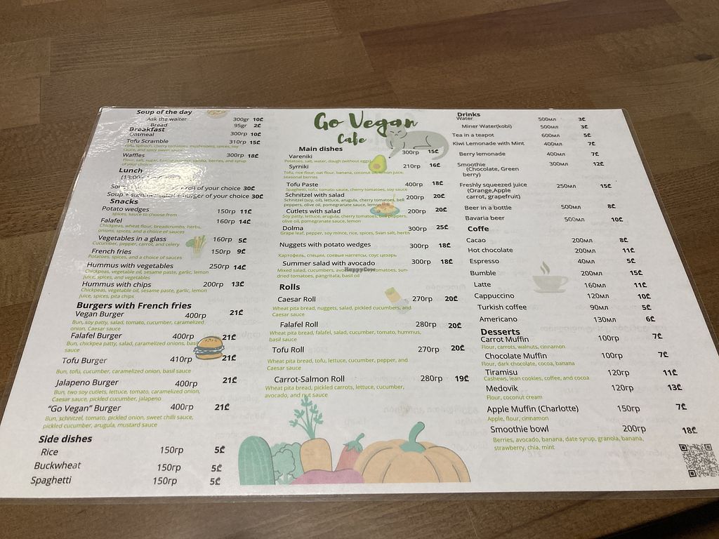 We loved the tofu burger, green smoothie and cheese pancakes! Always happy to support an all-vegan place. The recipe for the carrot salmon roll might need a revision; it tastes a bit too much like cooked veggies. Especially warm lettuce is funny. Will go back next time in Batumi!