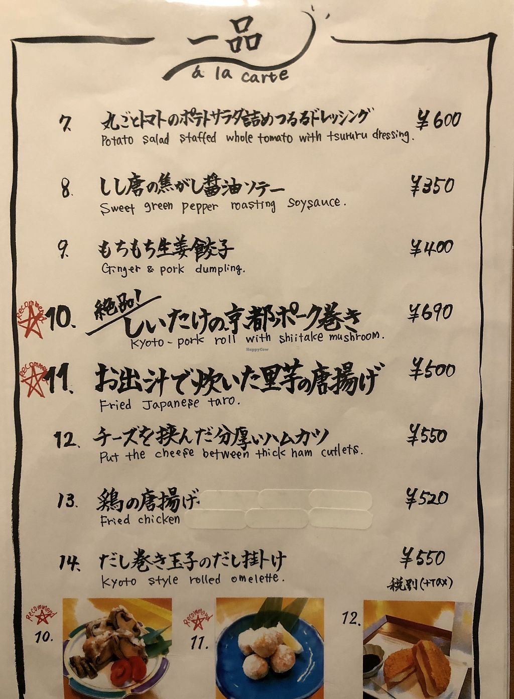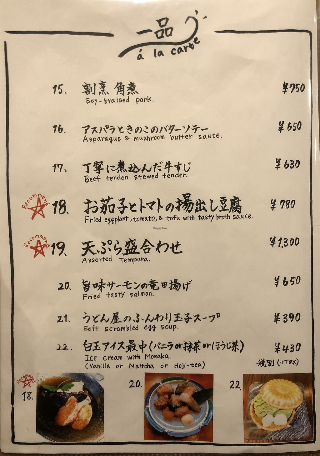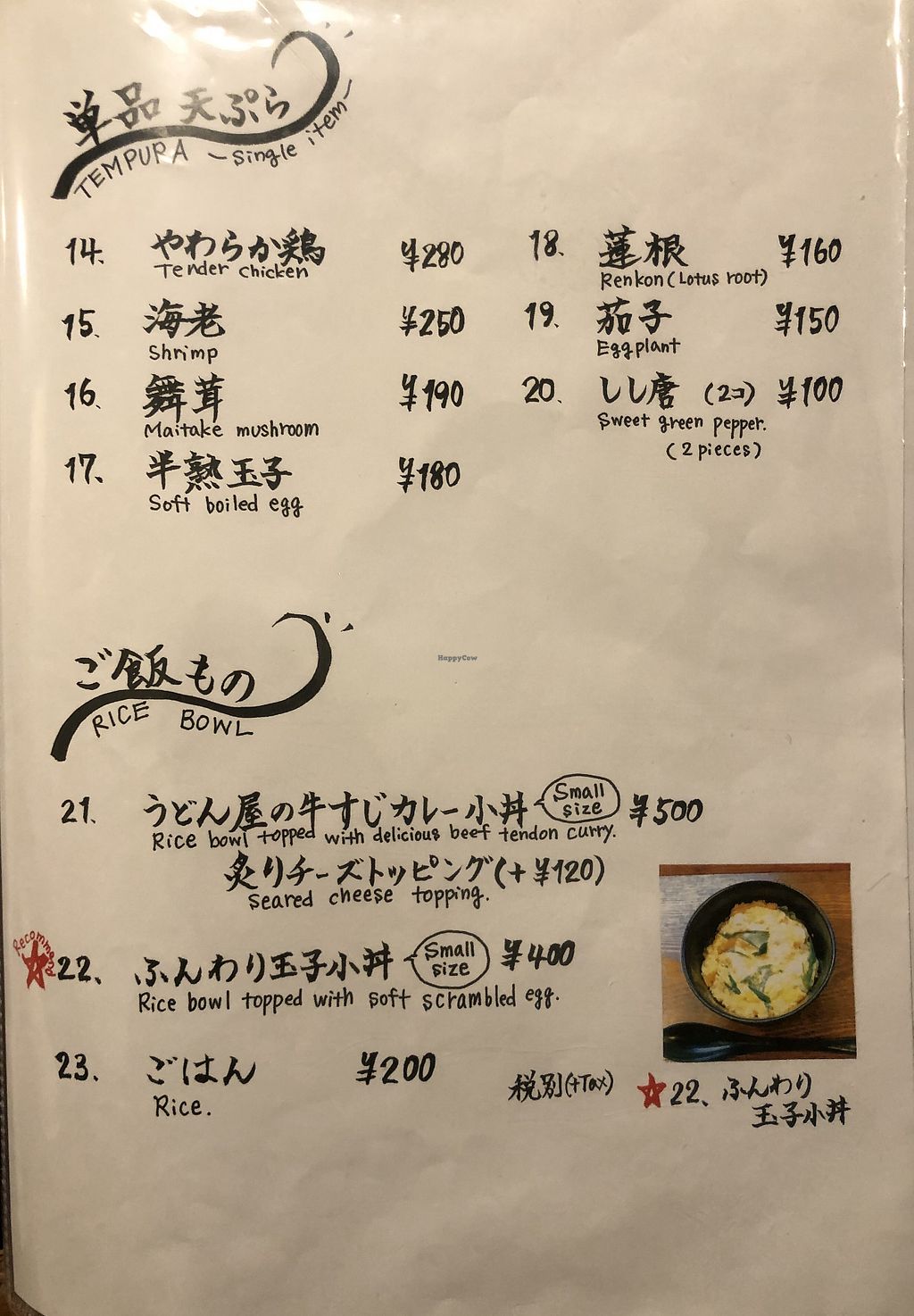 Serves meat, vegan options available. Udon restaurant. Offers one vegan udon dish made with tomato & vegetables-based broth. There's also potato salad with vegetables, and veg starters. Menu is in English, and staff can speak English. Removed May 2023: Limited vegan options.