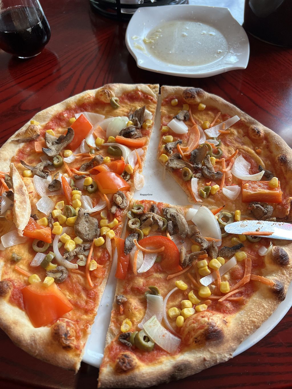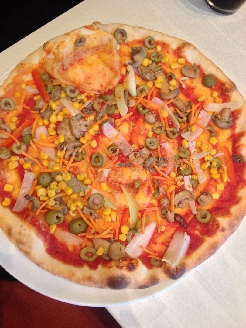 Veggie pizza without cheese. The crust is amazing and the toppings goo…