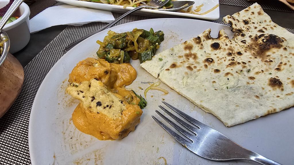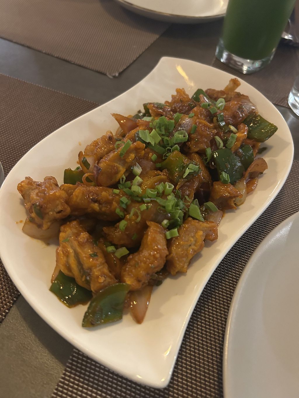 Vegan Chilli Ghobi (front), Soya Champ Masala (back), and rice.
