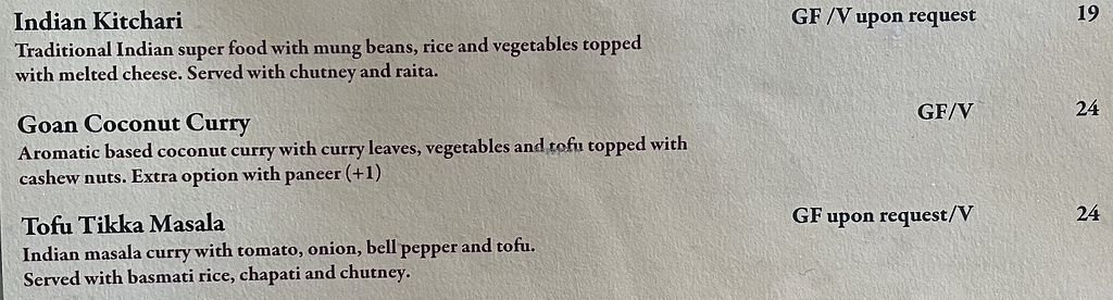 Friend ordered vegan-labeled dish, which has a suggestion to add paneer. It was their first time eating Indian food and didn’t know it would be dairy. The staff didn’t apologize and refused to make eye contact when we said we couldn’t have dairy and weren’t aware it would contain dairy based on how the menu was labeled. They just said it’s impossible to have vegan paneer and walked away. Very disappointing considering the price point of the restaurant.