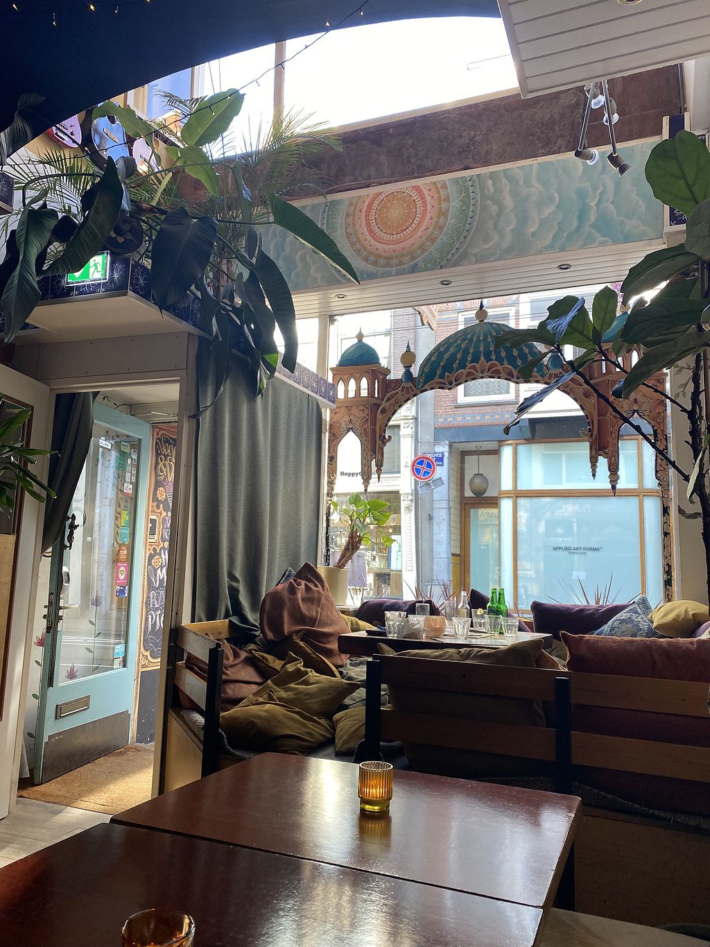 Super cosy vibe, as we had the spot in the window with pillows and low table. Nice and affordable vegetarian and vegan food in Amsterdam. A mix of (inspired by) Indian, South East Asian dishes & pizza. Super friendly staff and fast service.