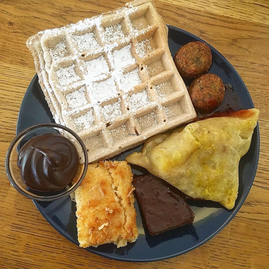 Brunch: waffle, falafel, samosa and cake