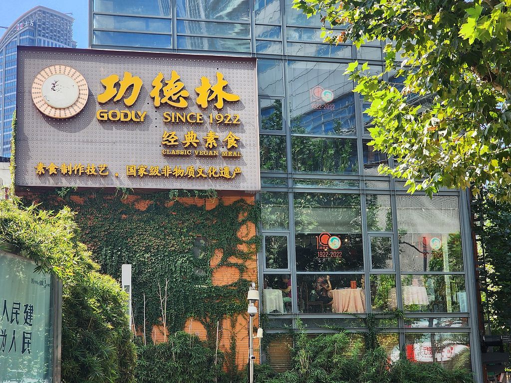 功德林 brand was originally established in 1922. Offers extensive menu with a variety of mock meats. Serves noodles on the first floor and the full menu on the second floor. Some menu items are in English. Air-conditioned. Reported to close earlier than stated times. Open Mon-Sun 6:30am-9:00am, 11:00am-2:00pm, 5:00pm-8:00pm.