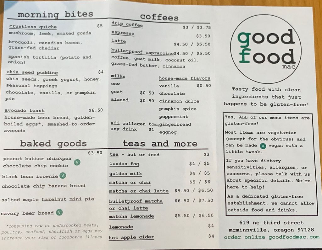 So happy to have found this newly opened place in downtown McMinnville. It’s all gluten free and clearly marked vegan options (are or can be). The staff was very kind and helpful/knowledgeable in selecting what I got for lunch.