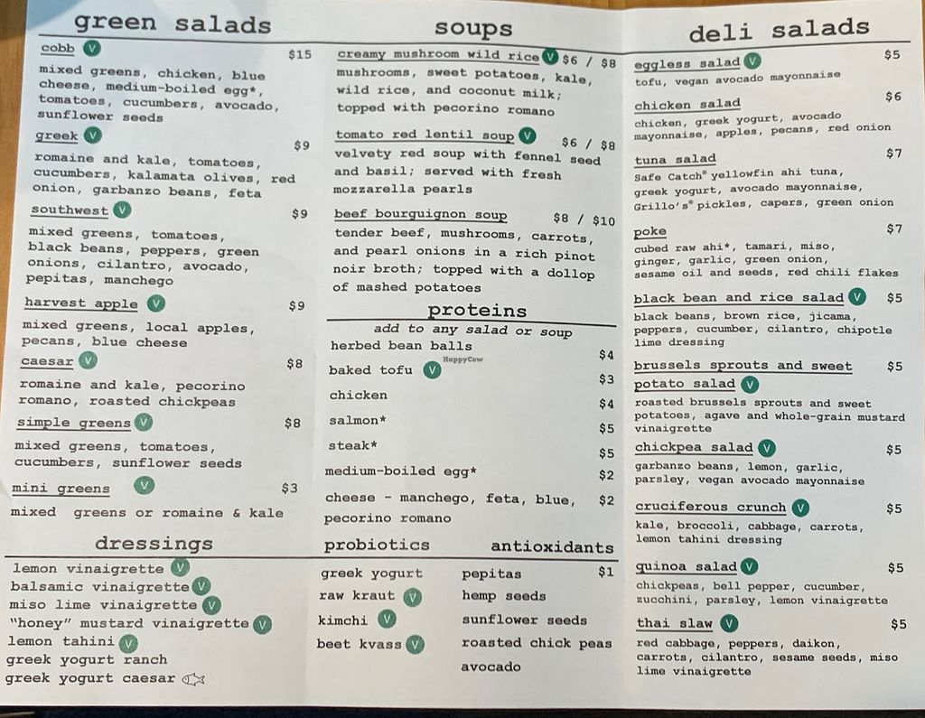 Serves meat, vegan options available. Café with clearly marked vegan options like Eggless Salad, Chickpea Salad, and Quinoa Salad, as well as seasonal soups such as Creamy Mushroom Wild Rice. Most signature salads, including the Southwest and Harvest Apple, can be veganized by removing animal products. Open Mon-Sun 8:00am-4:00pm.