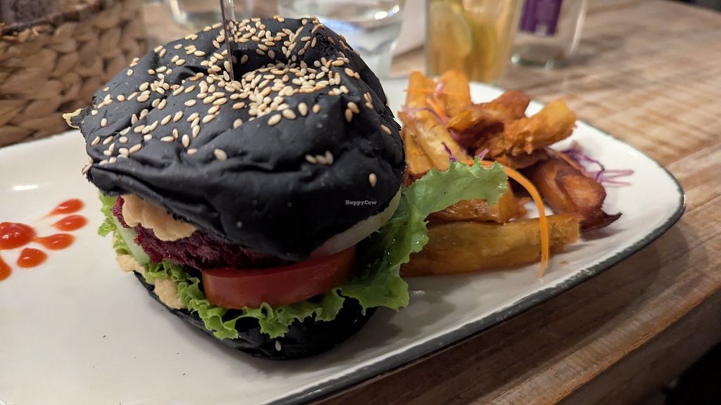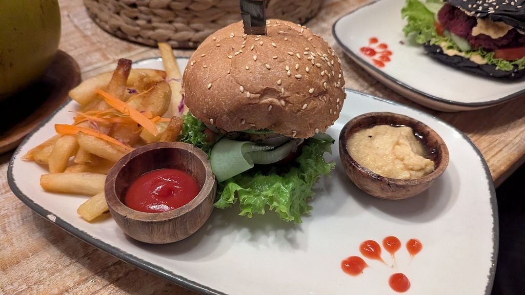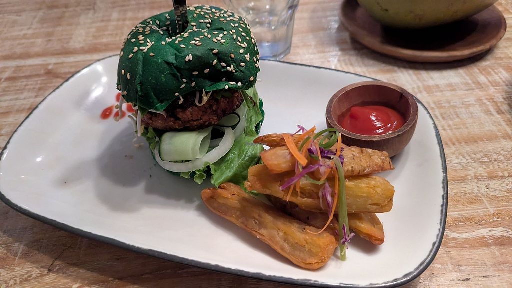 Great little place with great vegan burgers! They tasted great and with a cool colored bun they also make for great photos. They have a menu with clearly marked vegan options, breakfast, lunch and diner options. We had a smoothiebowl, burgers and tofu skewer and it all tasted great ( I preferred the tempeh burger with spinach bun!) would go for breakfast too. They are reasonably priced, had dinner and drinks with 5 for around 600k. The location is pretty neat and they have some indoor AC seating. Would recommend.