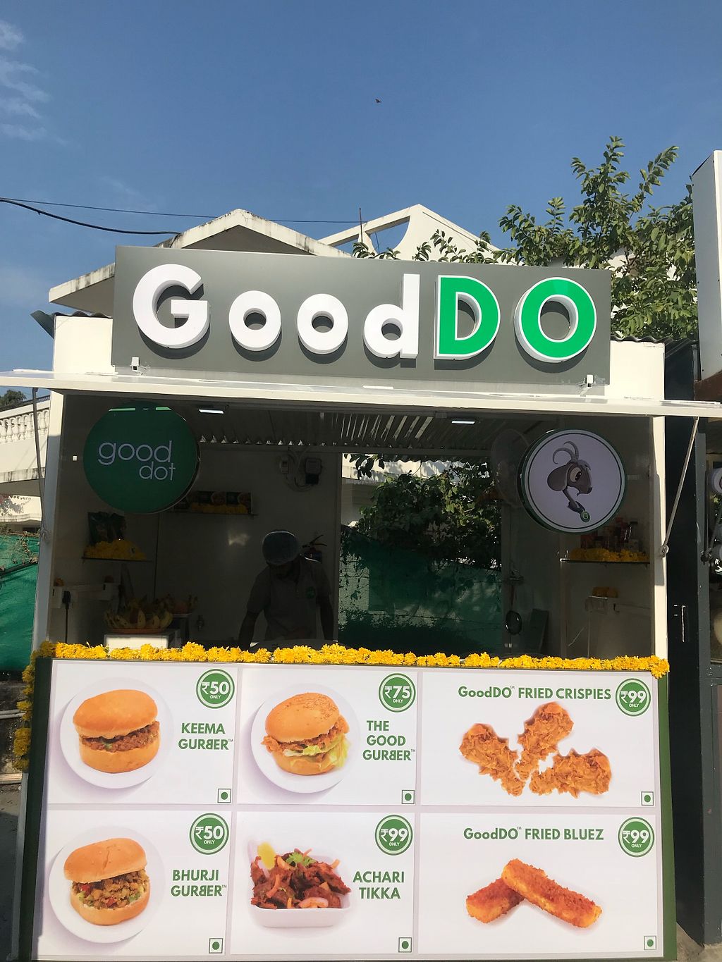 Vegan fast food small chain based out of Udaipur. Uses plant-based meat alternatives in many dishes. Menu offers burgers, fried crispy strips, fries, spring rolls, and Indian dishes like keema pav, biryani, and curries served with paratha. This outlet is a stand inside of a food court near Sukhadia Circle statue. Reported closed October 2022.