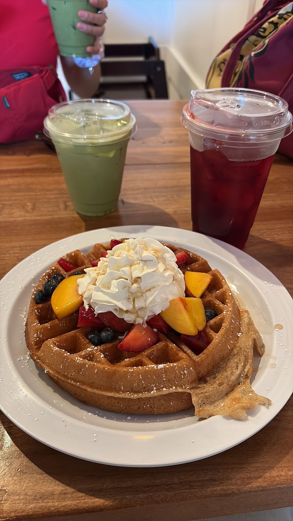 They have several vegan options. The waffle I ordered was supposed to be vegan, but it wasn’t—I could tell from the first bite. They had made a mistake, but they quickly gave me the vegan one, and it was actually really good! I recommend double-checking your order just in case. Price-wise, it’s one of the most affordable places I’ve found in Santa Barbara. The drinks are also amazing—iced matcha and hibiscus tea were SUPER tasty!
