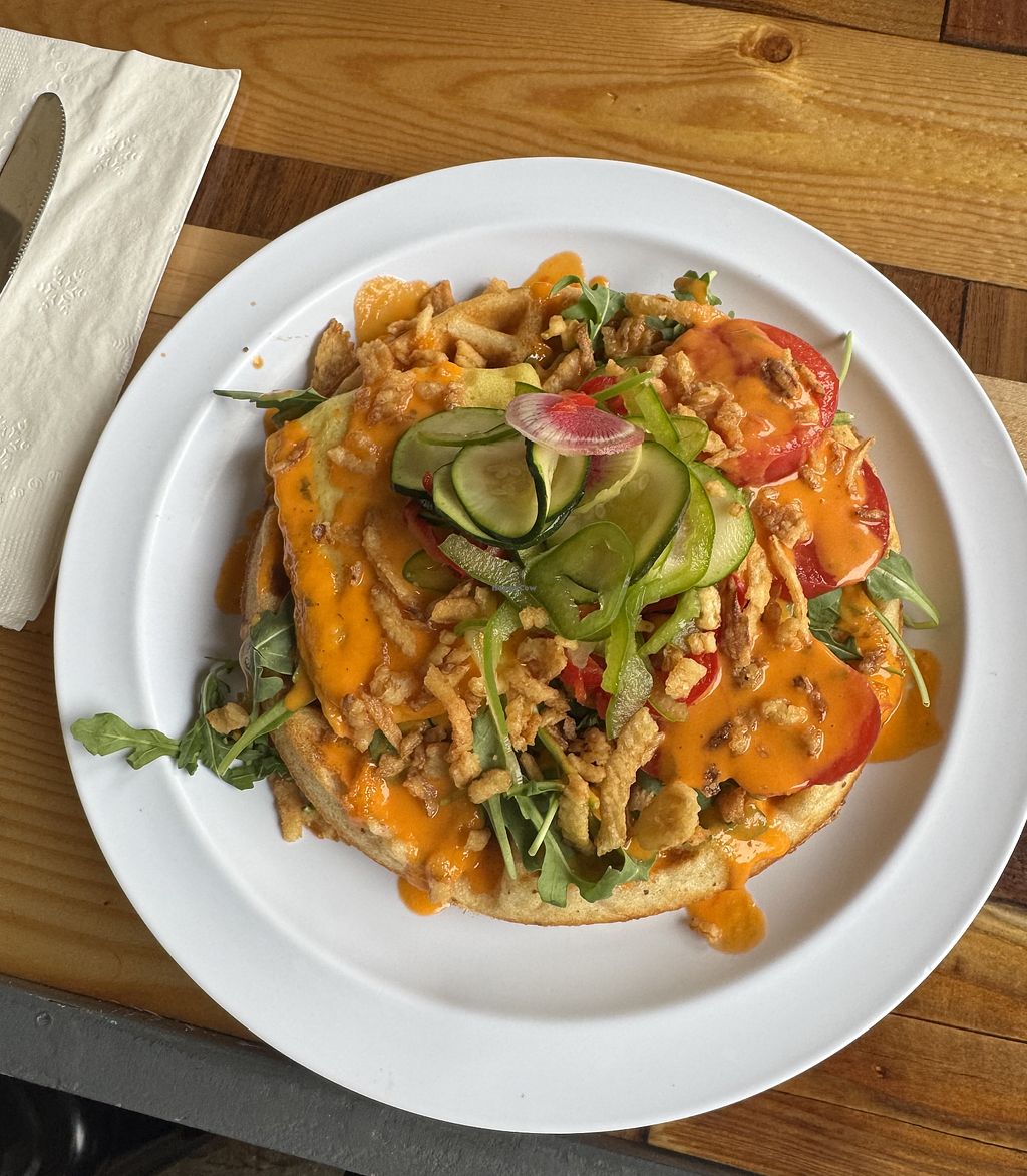 I love that you can get both a savory and a sweet vegan waffle here. The savory one is topped with JUST Egg, arugula, avocado, thinly sliced radish and pickles, and a tangy vinaigrette. The sweet one has berries and coconut whipped cream. I also got an oatmilk cappuccino, and I love that they give you a coffee in a real mug if you get it for-here. My son had an oatmilk chocolate milk which he said was very good.