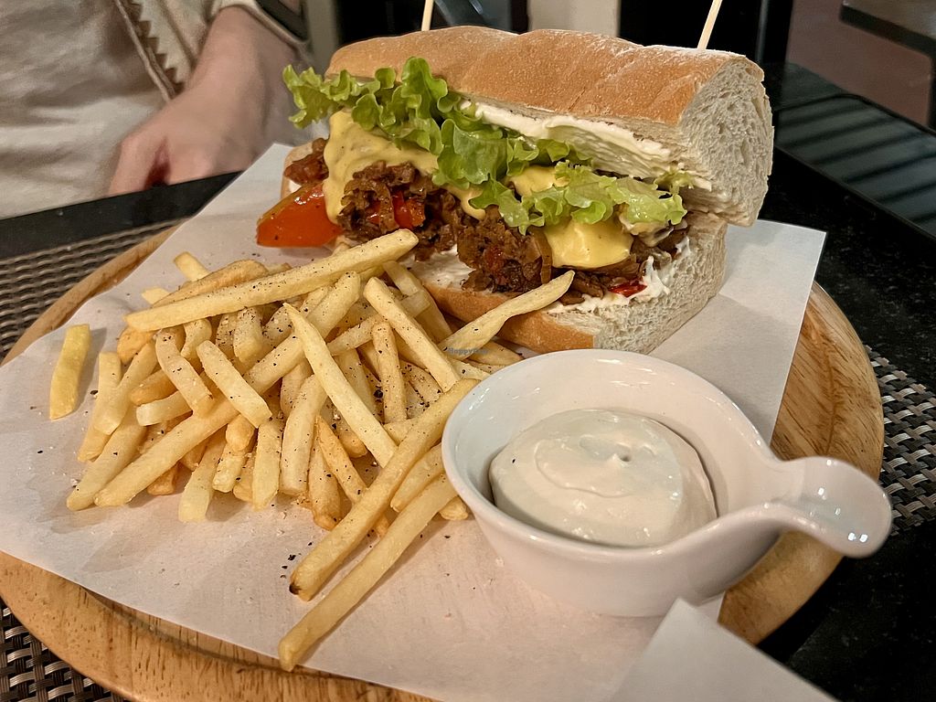 Read moreThe Chiang Mai specialty noodles were really good. The regular version at other restaurants is with egg noodles so it might be quite rare to find a vegan version. The scrambled tofu was probably seasoned with black salt for egg flavour. My non-vegan friend said it tasted exactly like egg. I really liked the dip (aioli?) that comes with the french fries. The quinoa burger with grilled eggplant was okay but not that special.