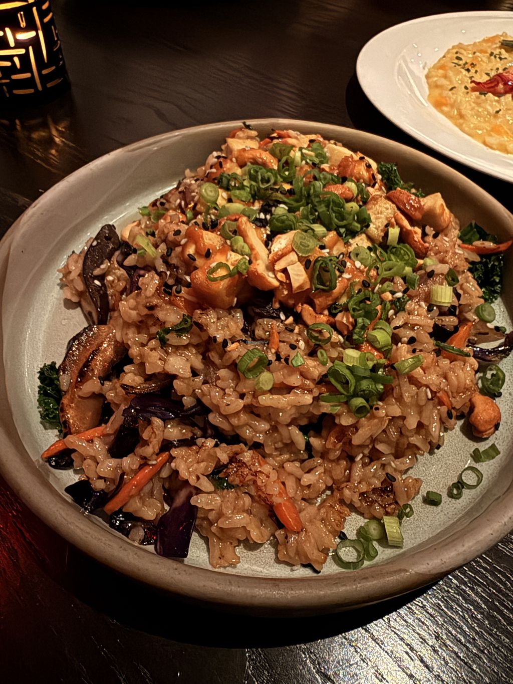 vegan risotto, tofu scallops, mushrooms, brussels sprouts