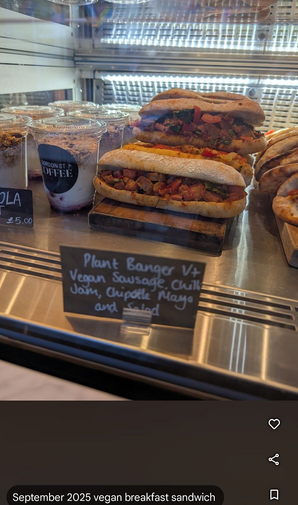 Serves meat, vegan options available. Coffee and light food. Stocks oat and soya milks. Offers a vegan pastry, and haggis roll can be requested without the meat. Open Mon-Fri 07:00-19:00, Sat-Sun 08:00-19:00.