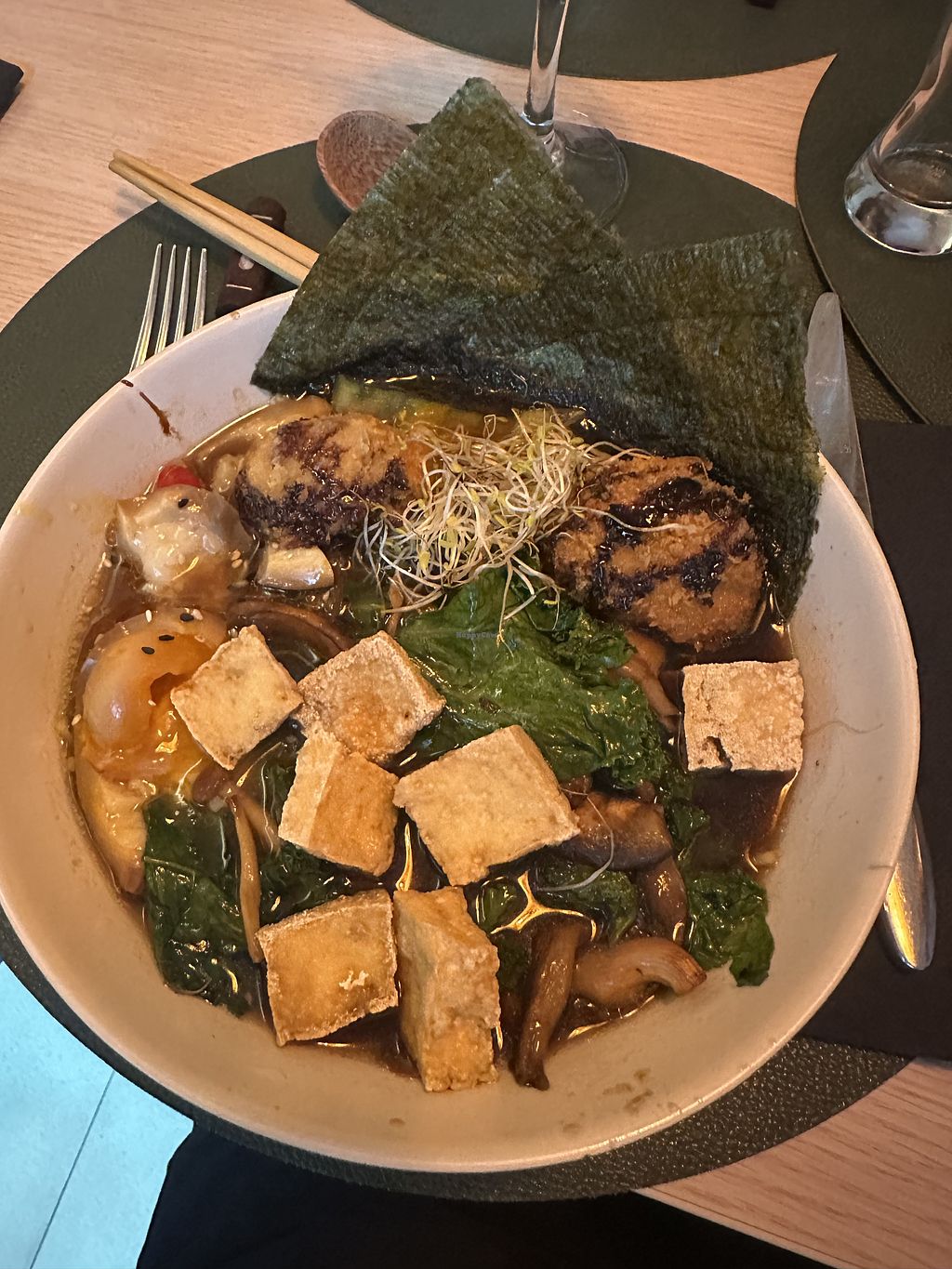 Food was so amazing, we had the magic mushroom ramen and the aubergine soba, and they were so good! Also all the natural wines were vegan too😄The staff were super friendly and even fried our vegan food separately. Definitely worth a visit😄