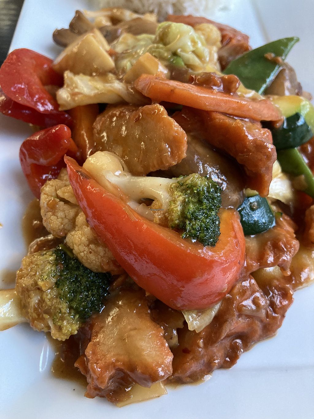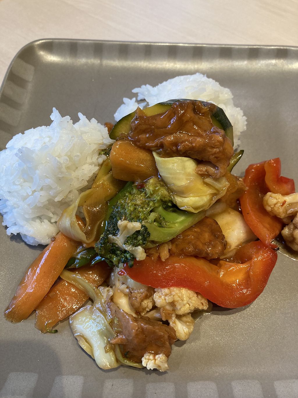 Several vegan options on request. There is “duck”, “beef” or tofu in red curry or lemongrass-chili sauce. Just say You want it vegan and the owner knows what it is. Really fresh and delicious thaifood and the portions are big with lots of different vegetables.