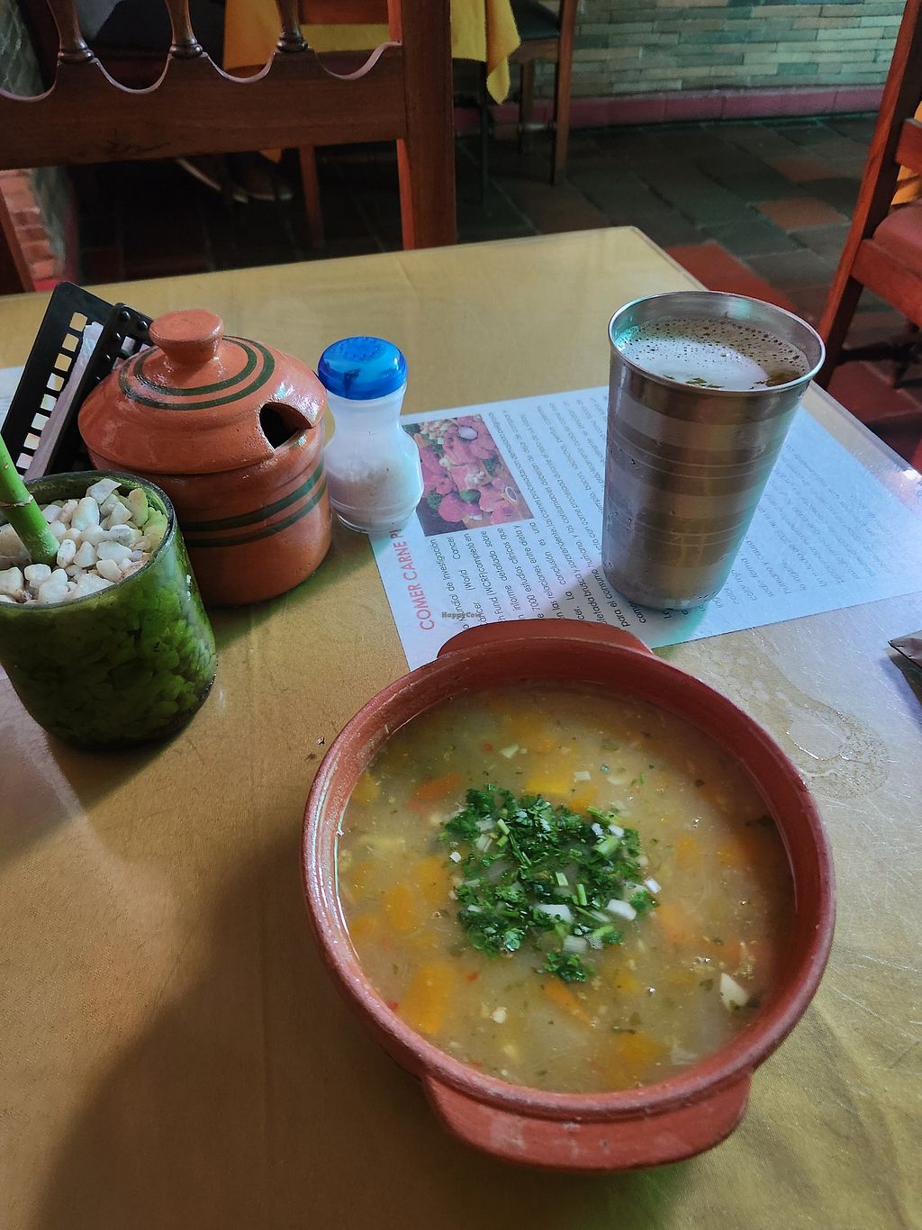 cozy interior patio with sky view. delicious soup with carrot, potato, green peas. many cookies, bread, cake for sale. sou milk. soy yogurt. cheap. hari krshna styke