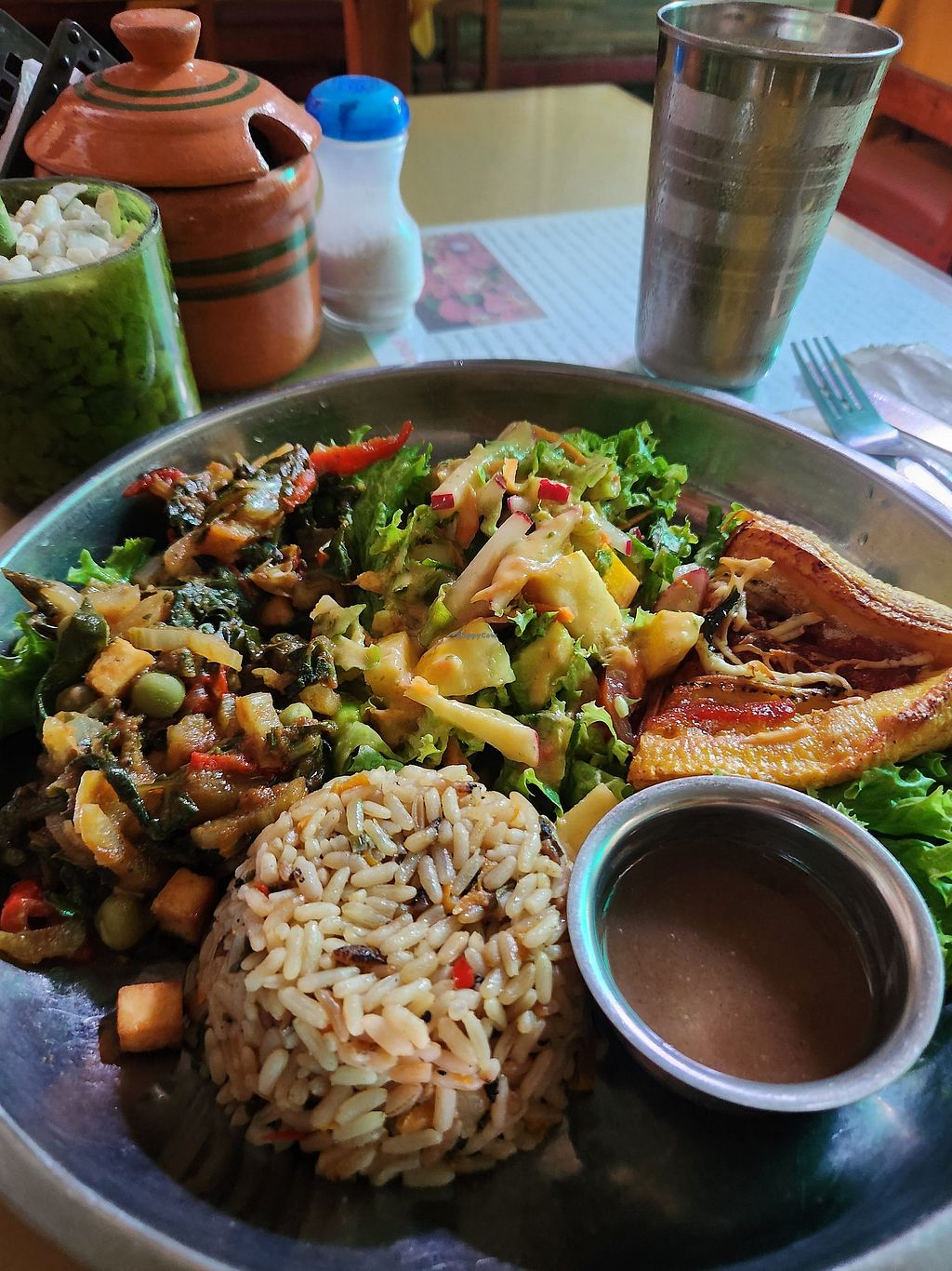 Plato del día equilibrado. Venden también pasteles horneados de garbanzo.