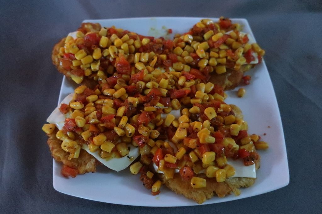 Patacones with cheese, corn and tomatoes