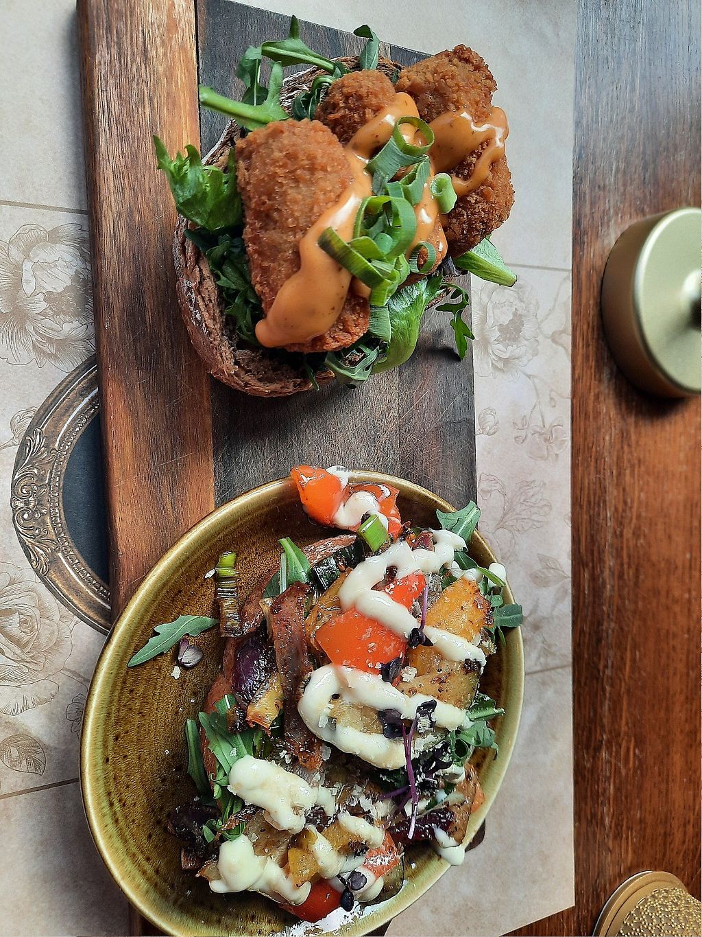 Serves meat, vegan options available. Restaurant and cafe with vegan choices. Menu is clearly labeled and includes vegan burger, falafel wrap, jackfruit croquettes, cauliflower wrap, grilled vegetable salad and soup. Open Thu 12:00-00:00, Fri-Sat 12:00-01:00, Sun 12:00-22:00. Closed Mon-Wed.