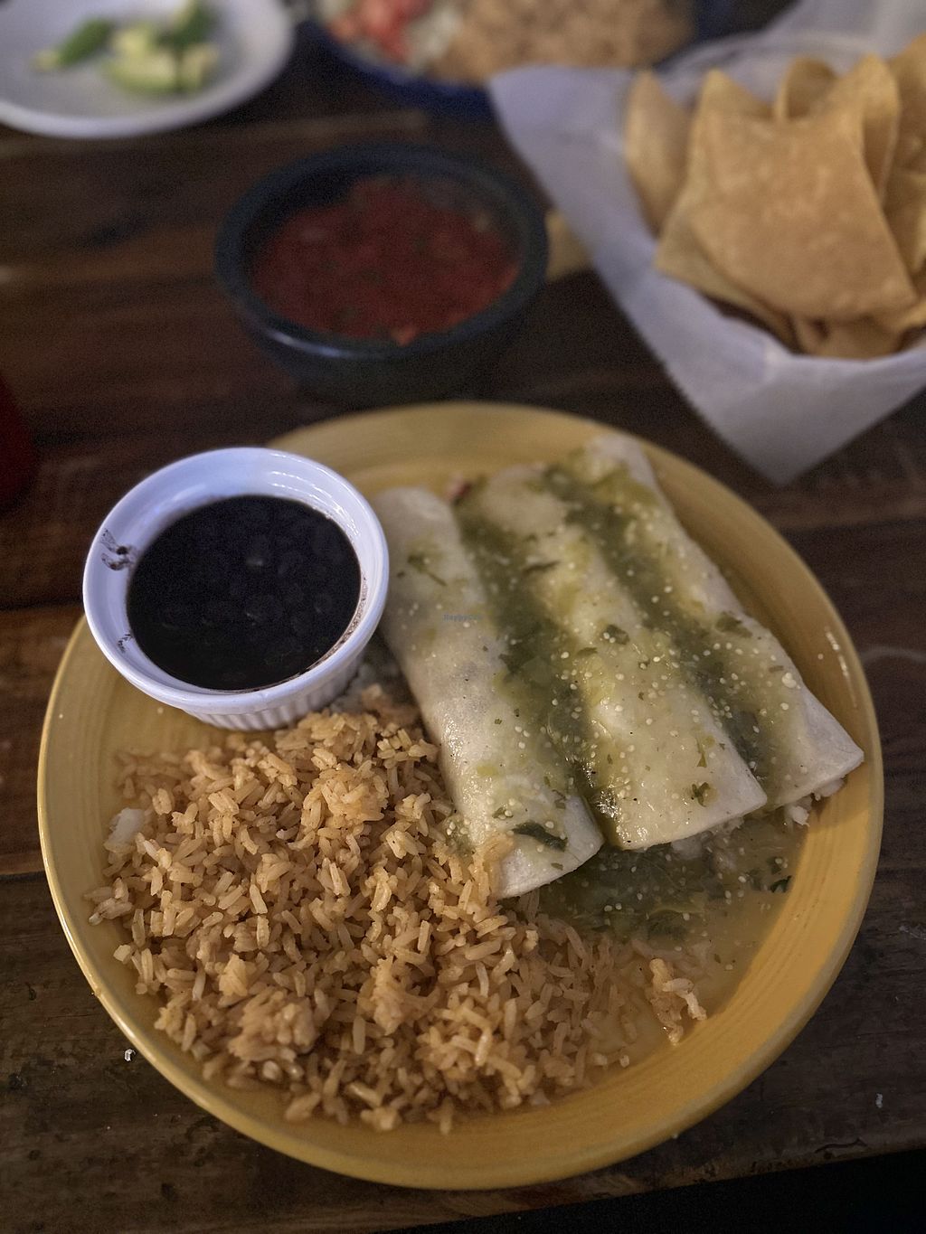 Enchiladas de papas with salsa verde and a side of rice and black bean…