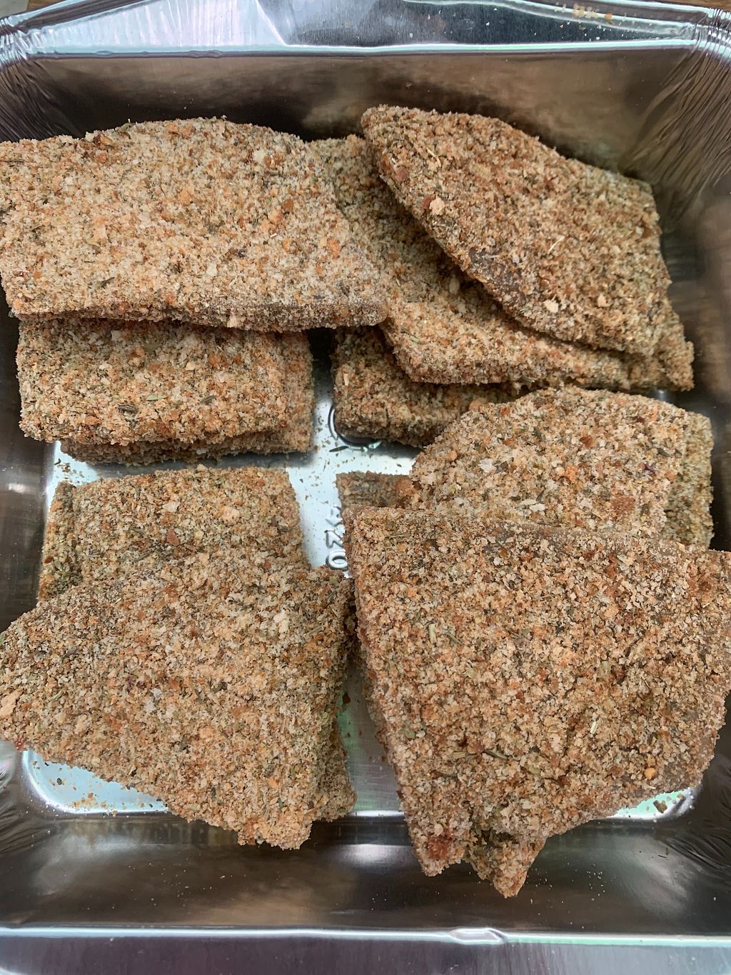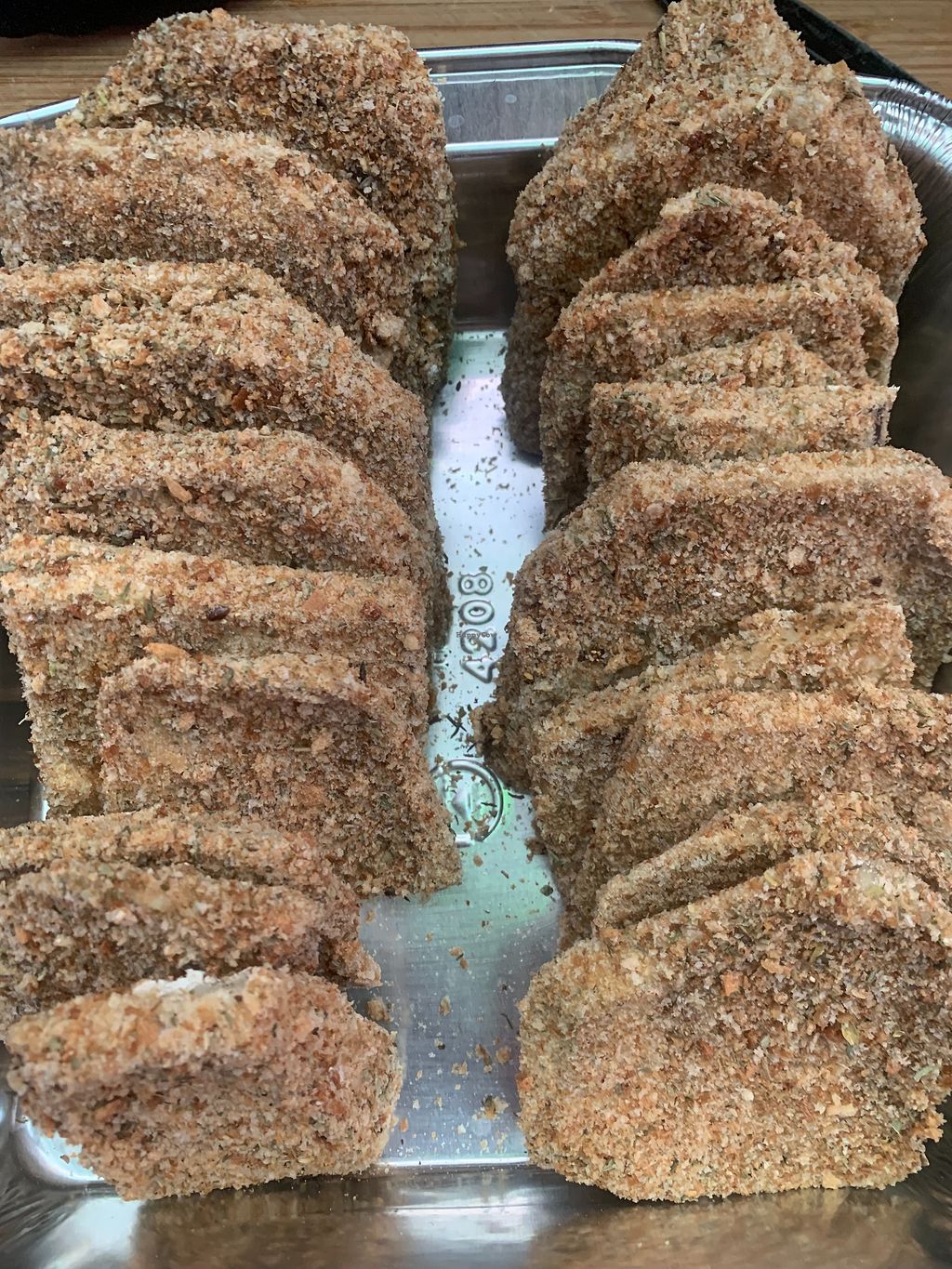 Tray of No Chicken Cutlets. house made cutlets and breadcrumbs
