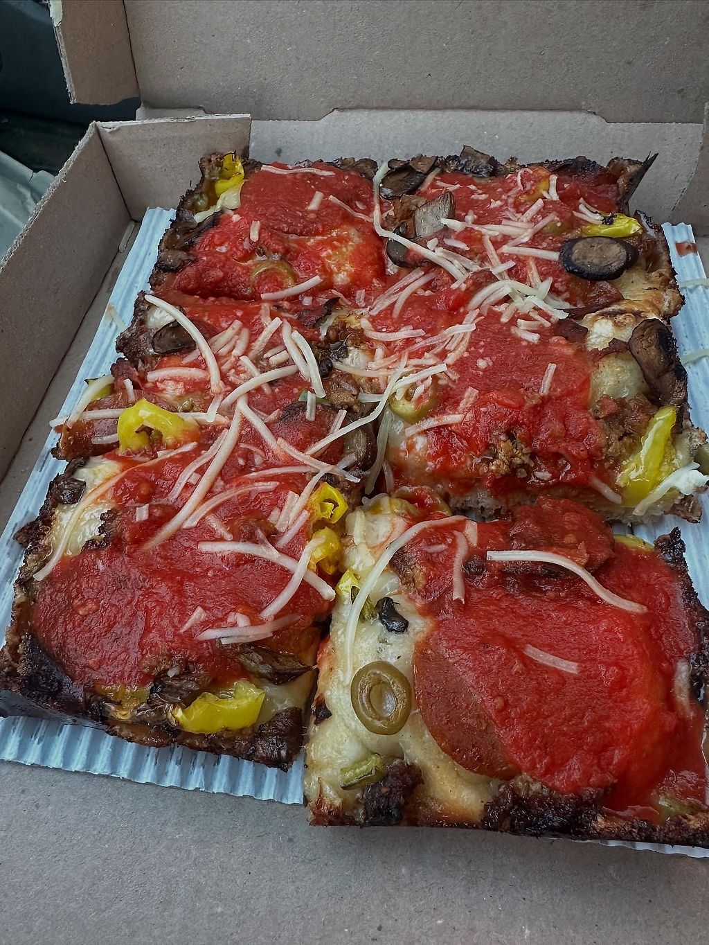 Grandma bobs goes hard for vegans and I really appreciate that!! The pizzas are stacked with toppings it’s not skimped and you’re not wondering why one slice has more than the other, you will not have that problem here!! This is a bomb Detroit style greasy pizza and it is something I crave quite often!! The pizza is top notch!! Wish I could give them a 5⭐️!