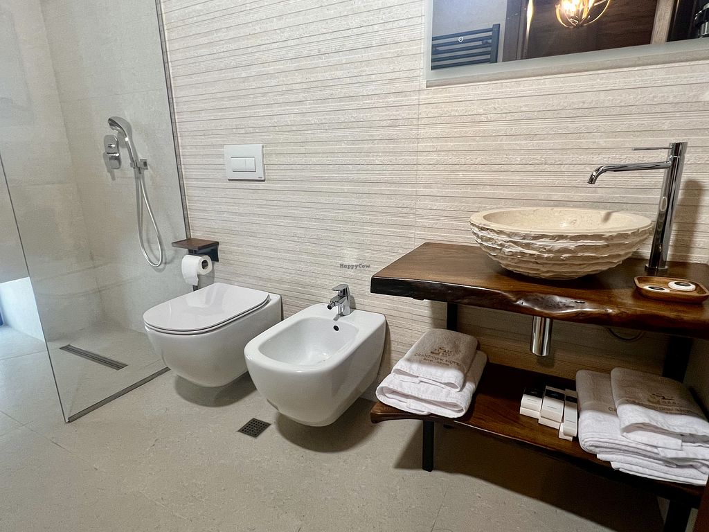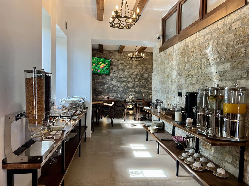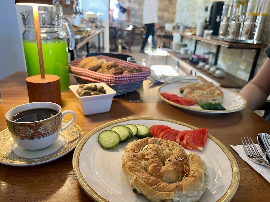 We stayed here for three nights and had a great time here. They’d been open about a month and we were their first vegan guests. We checked with them in advance that they could accommodate us and they really went out of their way to accommodate us as vegans. They provided us with soya milk and avocado & our own portions of bread, fruit, salad & cherry jam which wasn’t needed but we appreciated it. On the third day they made us vegan spinach bureks. We were given welcome drinks- they make their own wine (beer and soft drinks also an option). Excellent service, and staff spoke great English with one staff member speaking 5 languages fluently and could also speak several other languages. They offered laundry service for free & gave us a lift to the bus station (and would have collected us if we’d have let them know). They couldn’t have been more accommodating. The linen was of high quality, amazing bed, great shower. Should be a lot higher price that what we paid, but it’s likely the price increased anyway and we got an introductory price. Some rooms were super fancy with balconies looking onto the river and the old town. Would really recommend.