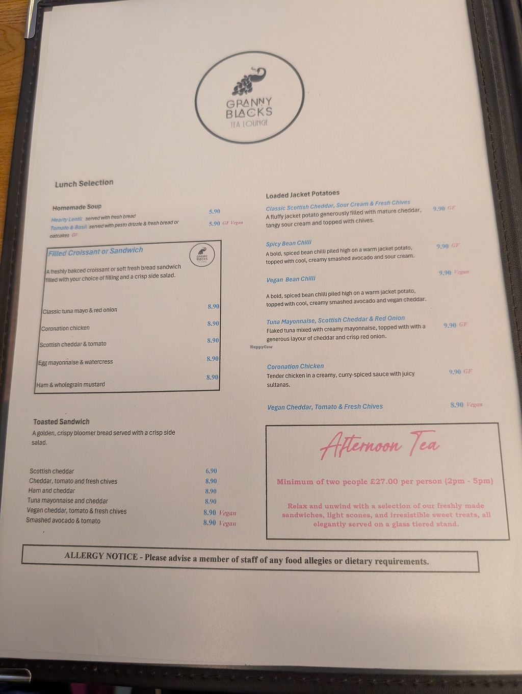 This cosy tea room is fabulous to get out of the cold. Its warm and welcoming. I had the vegan cheese and tomato toastie with a oat pumkin spice latte. It was a good portion. They also do soup, jacket potatos and have vegan sweat treats.