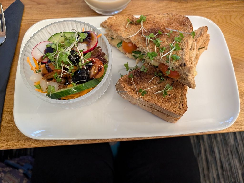 Serves meat, vegan options available. This is a coffee and tea place. It does lunch and has cakes., Vegan Cheese and tomato toasted sandwich