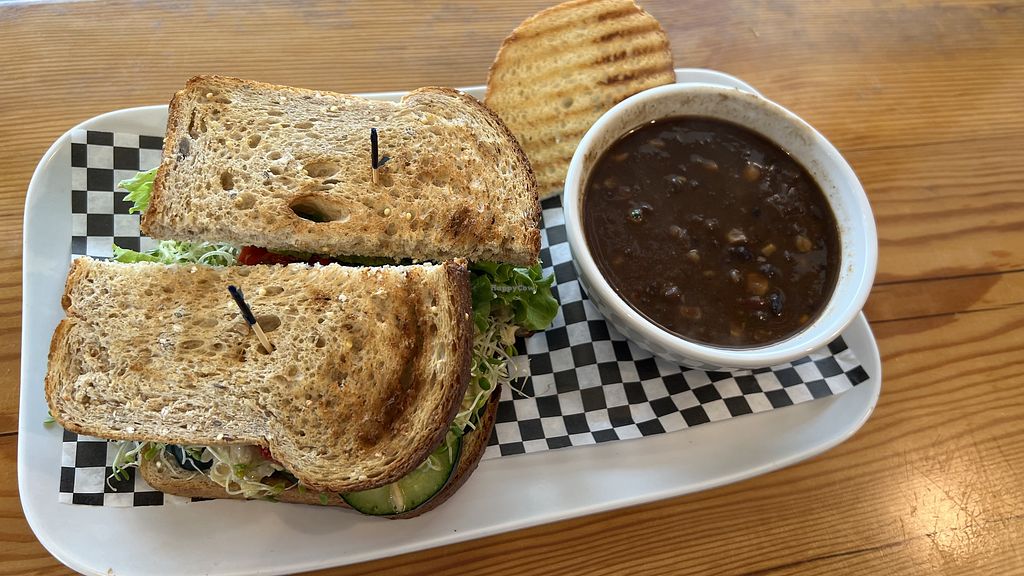 Hungry after a long drive so we decided to stop in. I had the Vegan Chickpea sandwich & a Lemongrass Salad, the person I was with had the Veggie Chickpea with a bowl of soup (I believe it was black bean). They were happy to add tomato to my sandwich for no extra cost. Staff was knowledgeable about veganism and could easily answer all questions.